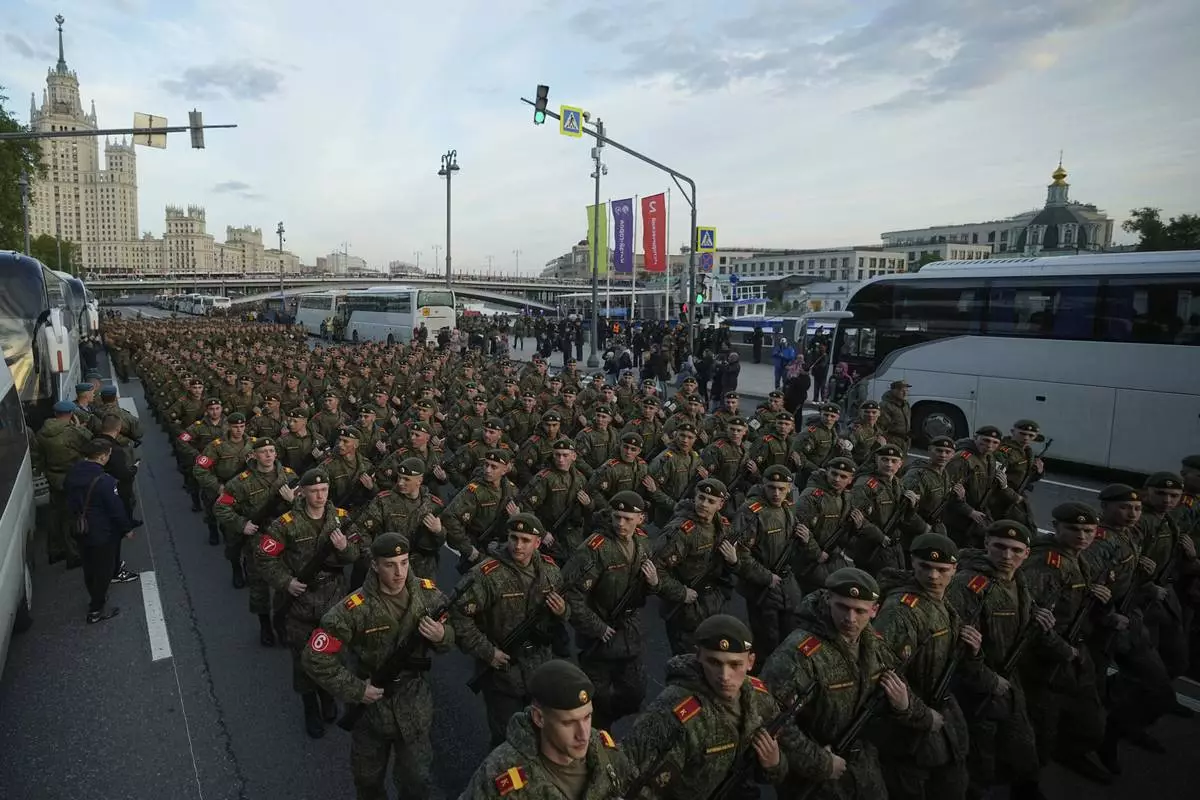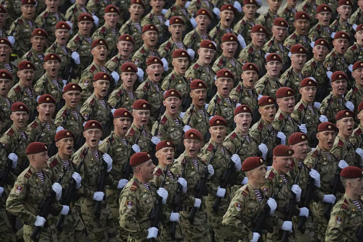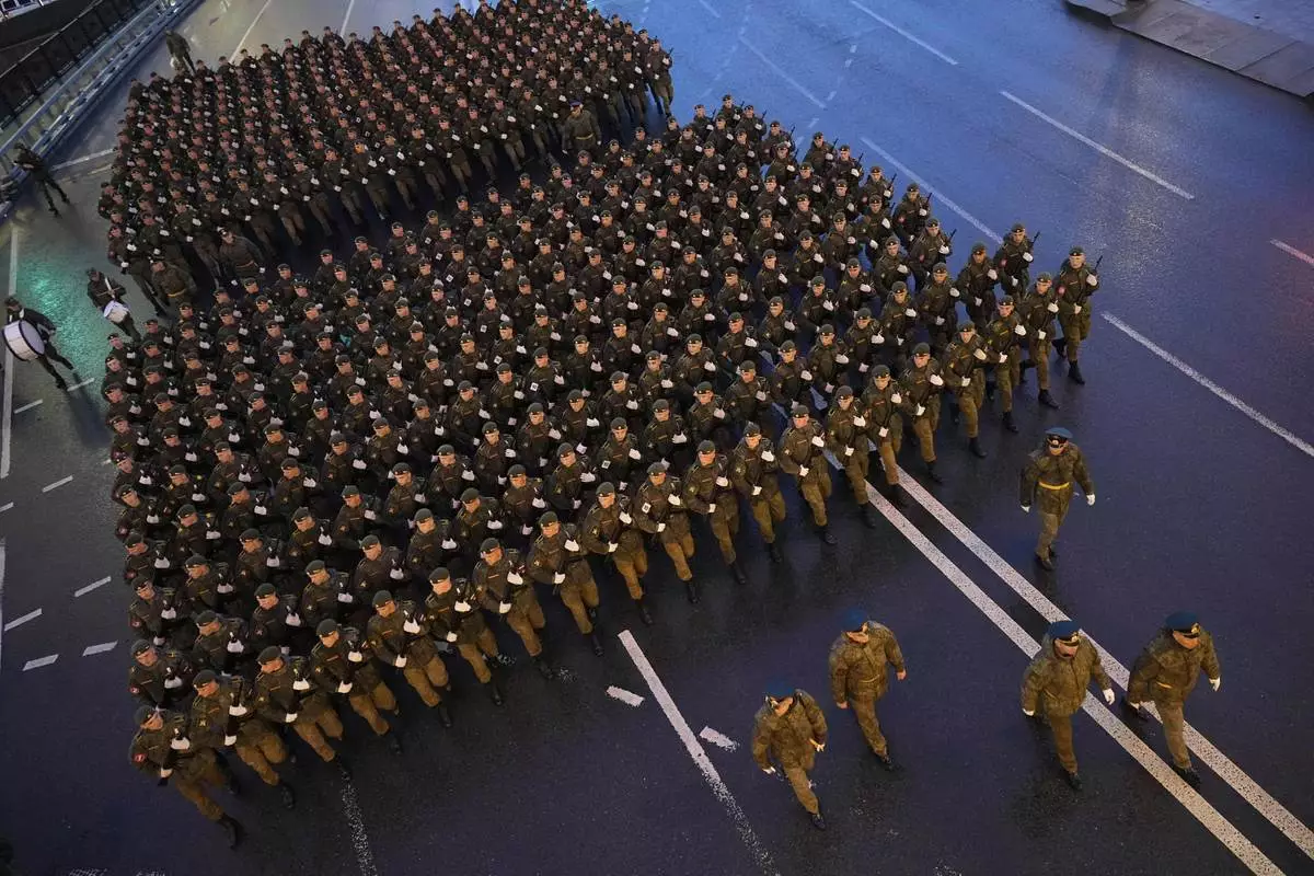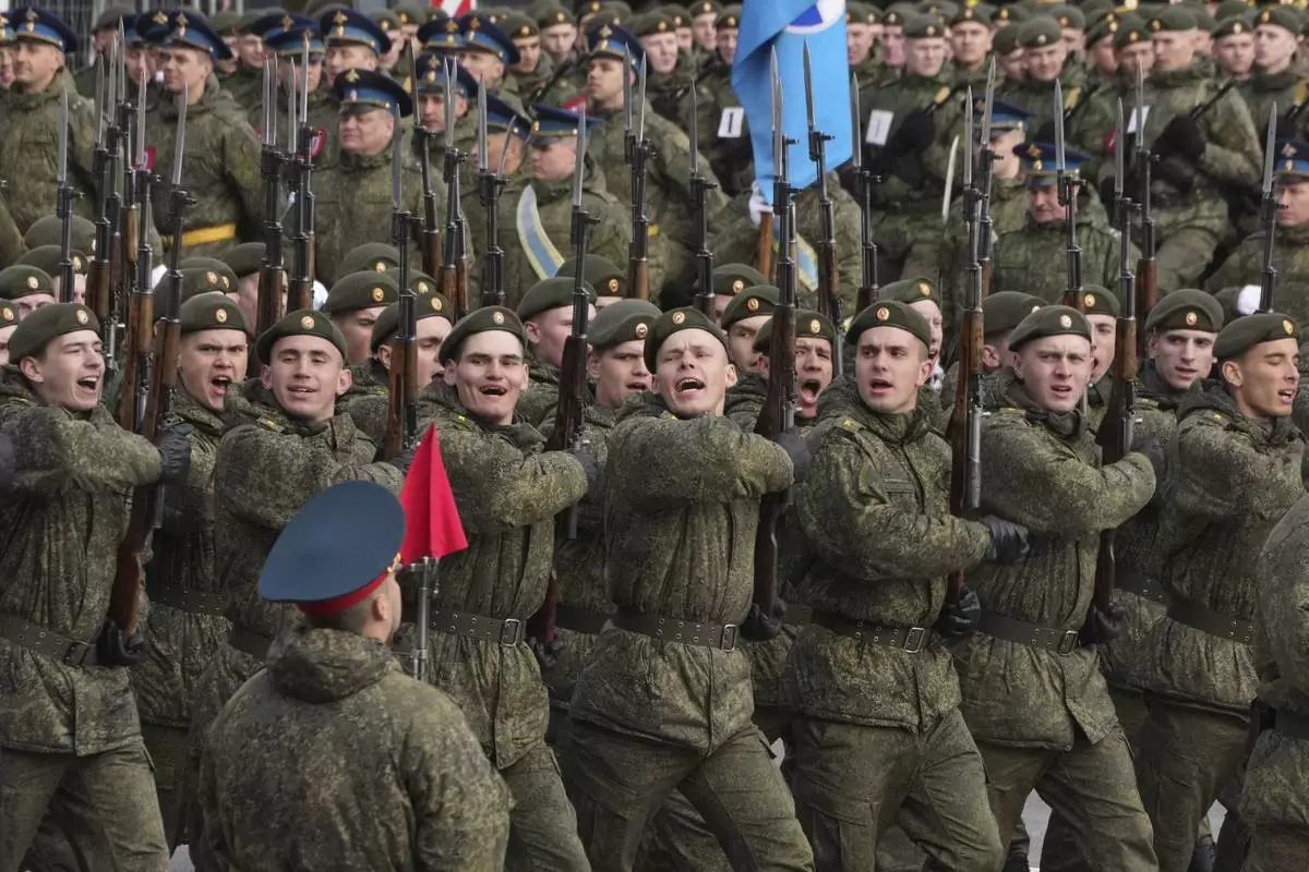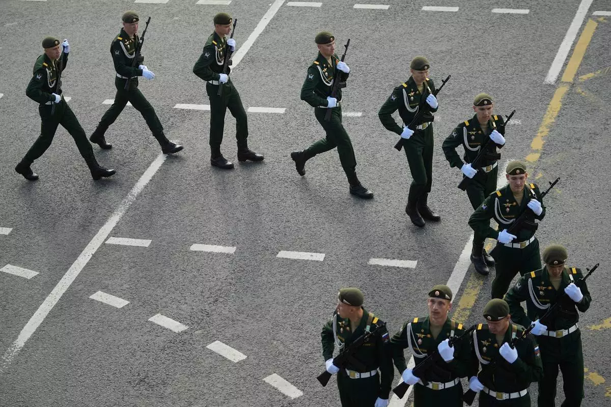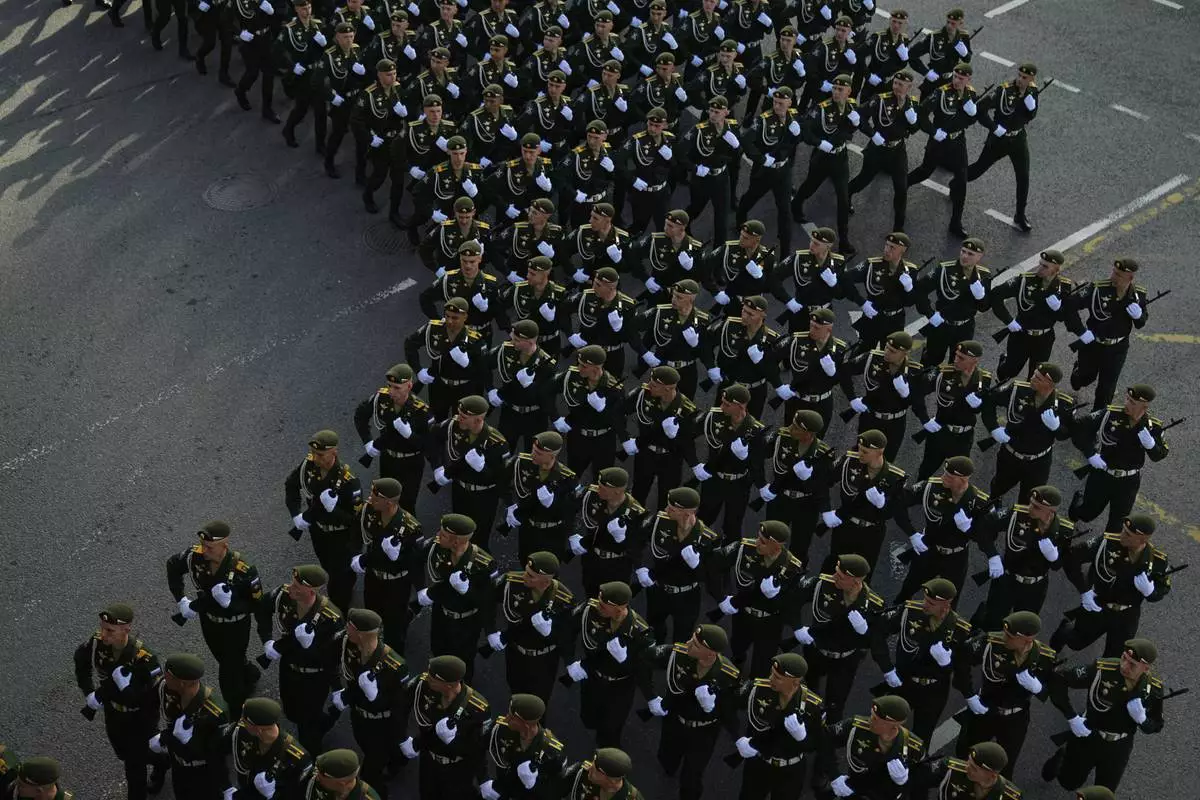 Troops march toward Red Square to attend a rehearsal for the Victory Day military parade in Moscow, Russia, on Tuesday, April 29, 2025. (AP Photo/Alexander Zemlianichenko)