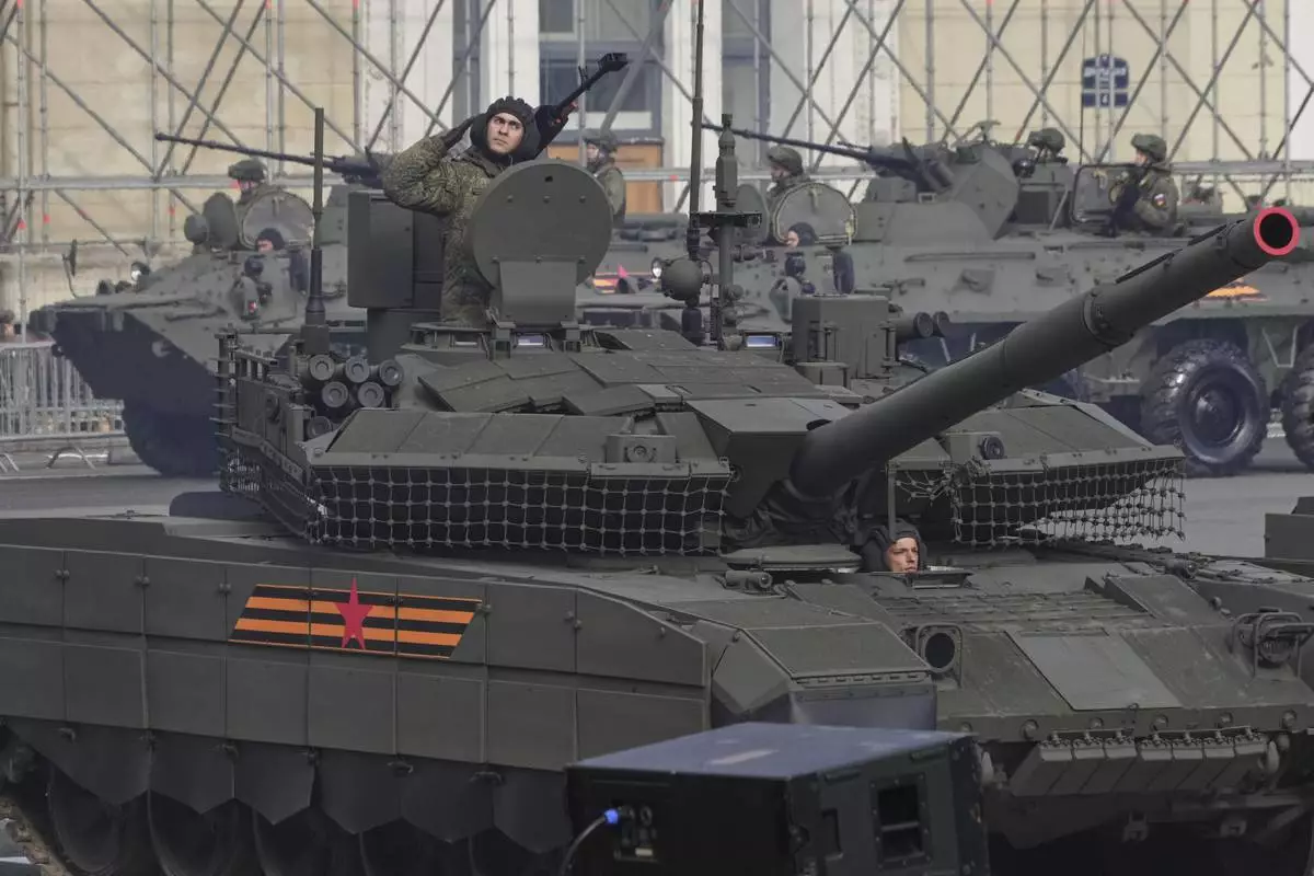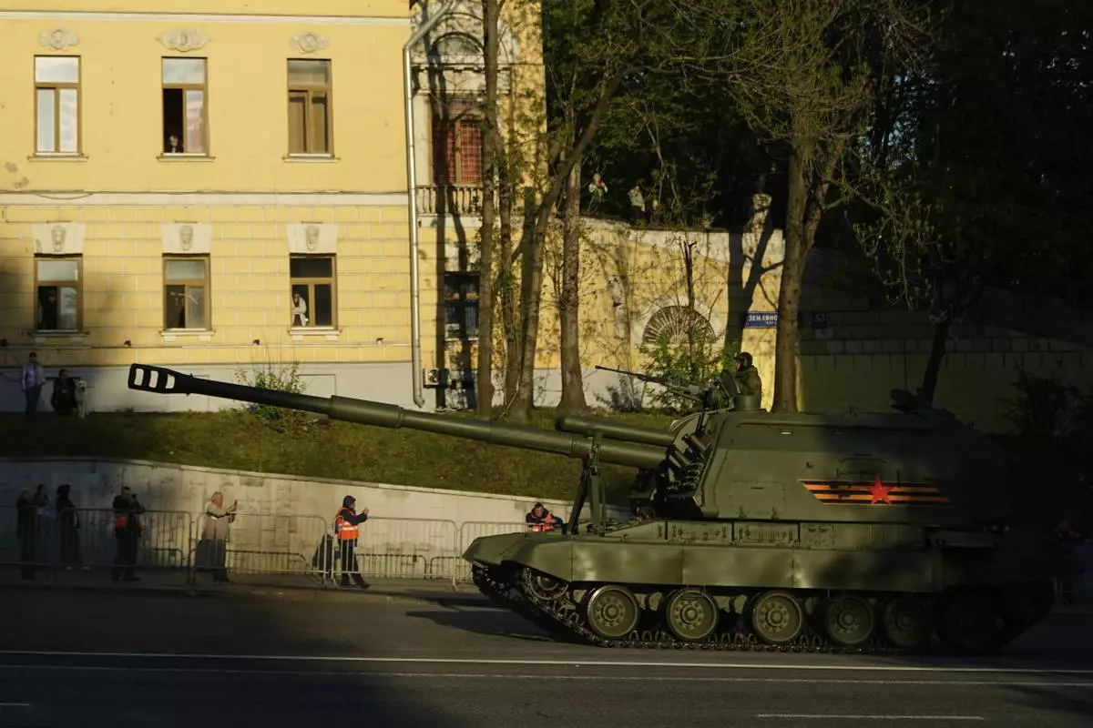 A Russian tank and a self-propelled howitzer roll along a street toward Red Square to attend a rehearsal for the Victory Day military parade in Moscow, Russia, on Tuesday, April 29, 2025. (AP Photo/Alexander Zemlianichenko)