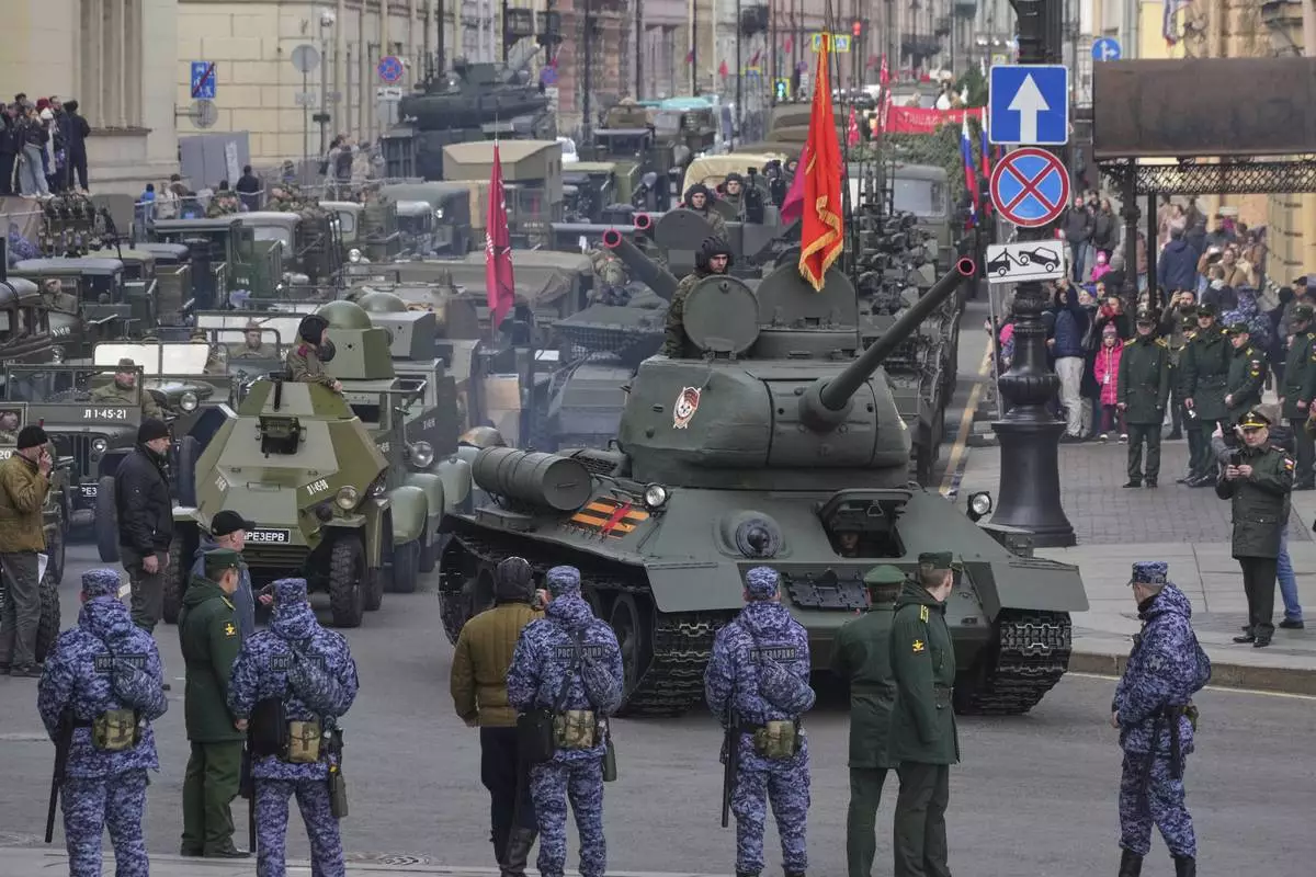 A Soviet era T-34 tank leads a column of military vehicles during a rehearsal for the Victory Day military parade at the Dvortsovaya (Palace) Square in St. Petersburg, Russia, Wednesday, April 30, 2025. (AP Photo/Dmitri Lovetsky)