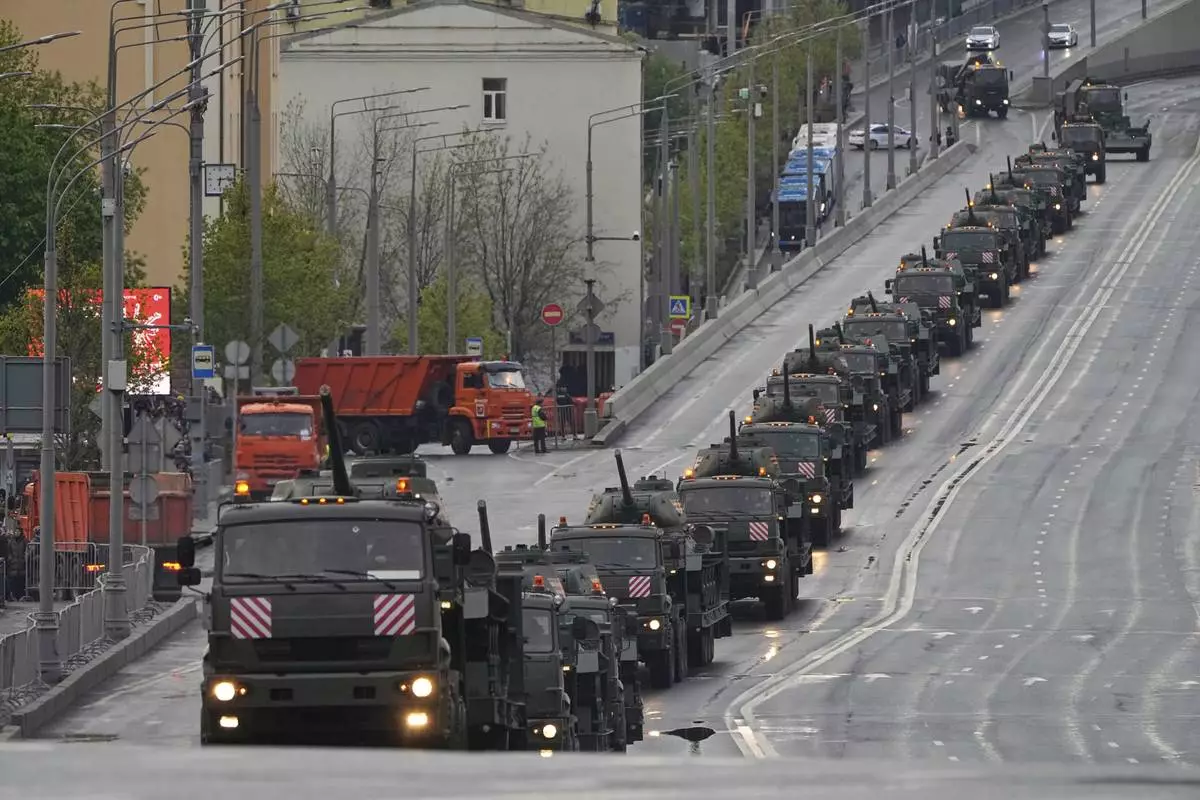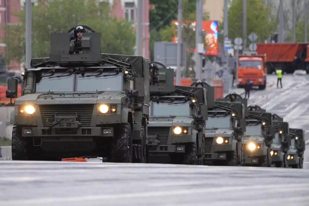 Russian armoured vehicles roll along a street toward Red Square to attend a rehearsal for the Victory Day military parade in Moscow, Russia, on Tuesday, April 29, 2025. (AP Photo/Pavel Bednyakov)