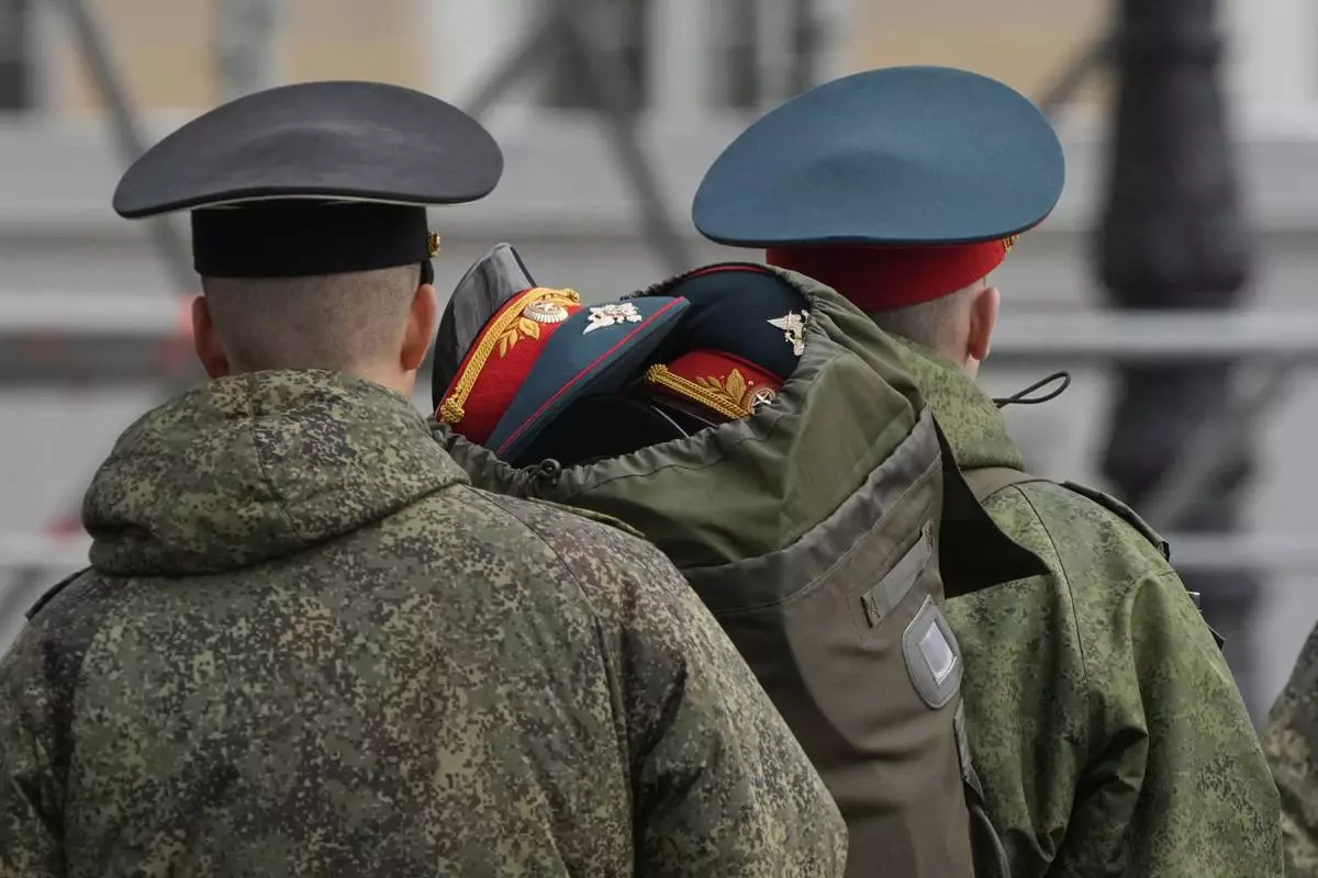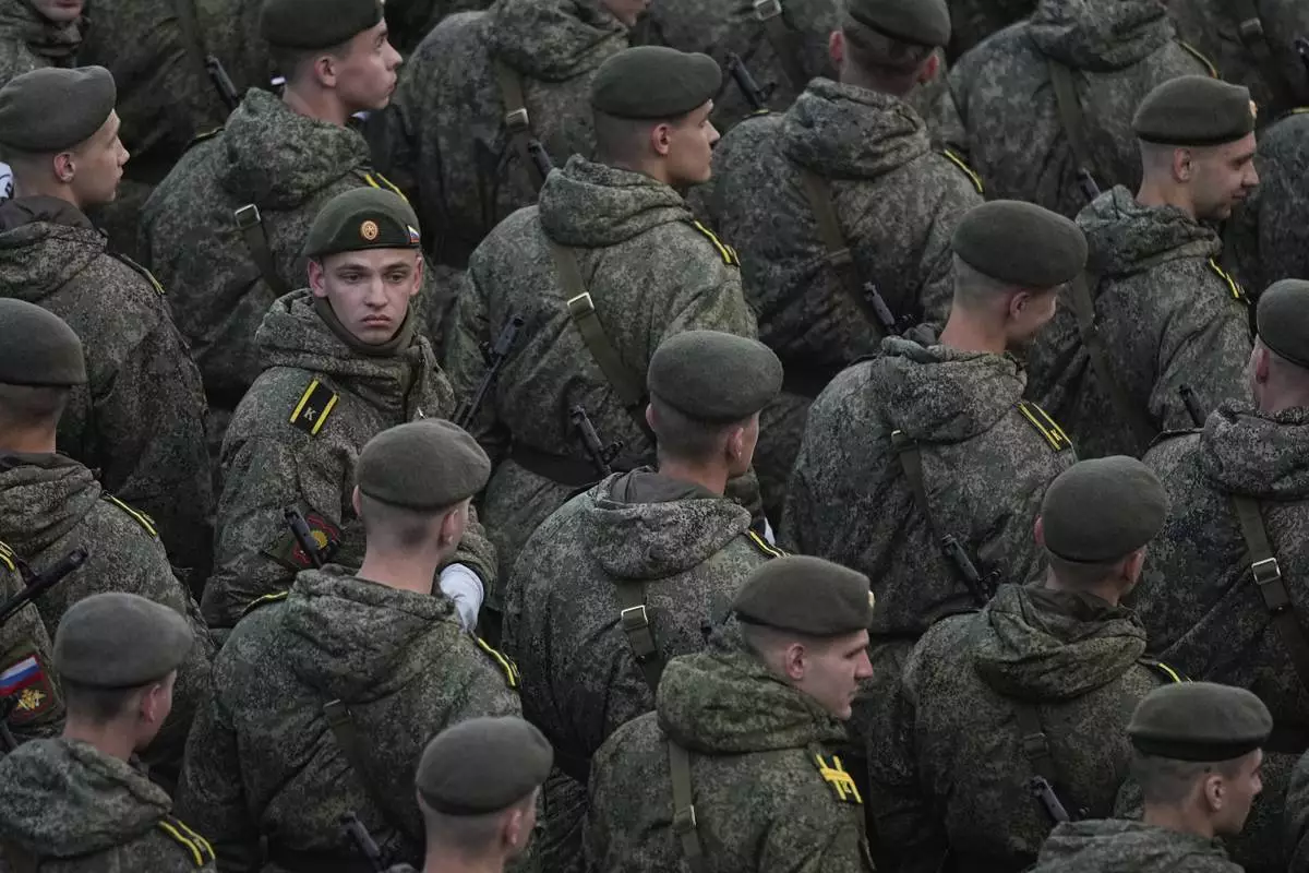 Russian servicemen gather prior to the Victory Day military parade general rehearsal in Moscow, Russia, Wednesday, May 7, 2025. (AP Photo/Pavel Bednyakov)