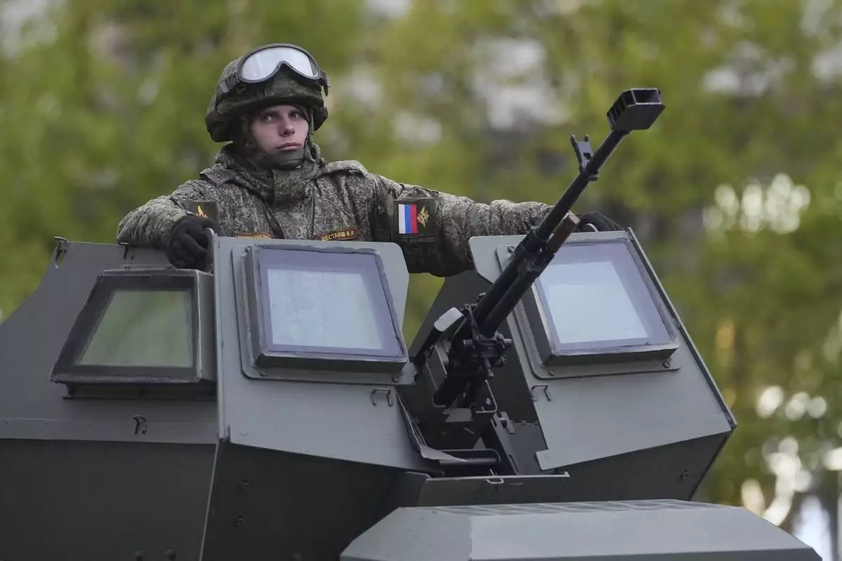 A Russian soldiers sits atop his military vehicle driving along Tverskaya street to attend a rehearsal for the Victory Day military parade in Moscow, Russia, on Tuesday, April 29, 2025. (AP Photo/Pavel Bednyakov)