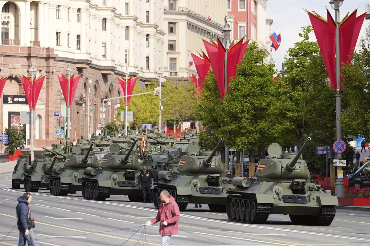 Soviet era T-34 tanks prepare to roll along Tverskaya street to attend a rehearsal for the Victory Day military parade in Moscow, Russia, on Wednesday, May 7, 2025. (AP Photo/Alexander Zemlianichenko)