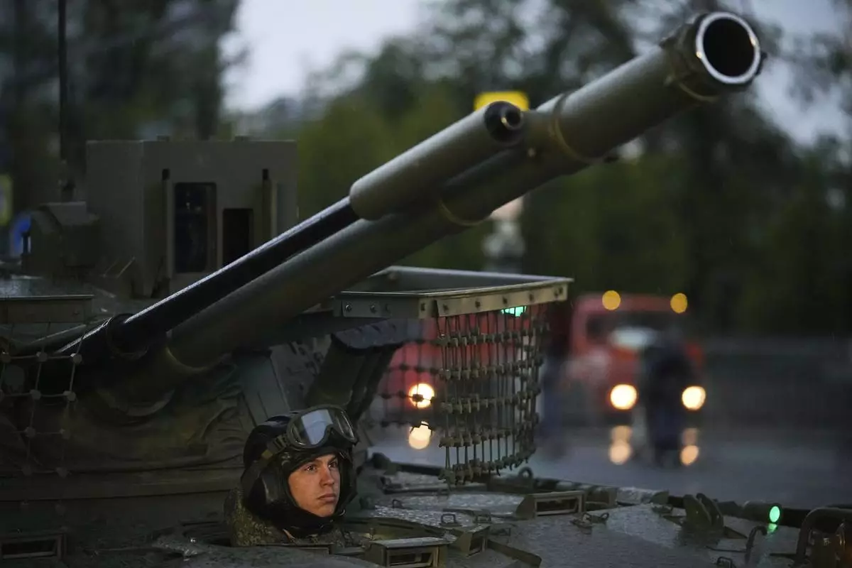 A driver sits in a tank driving along Tverskaya street toward Red Square to attend a rehearsal for the Victory Day military parade in Moscow, Russia, on Tuesday, April 29, 2025. (AP Photo/Pavel Bednyakov)