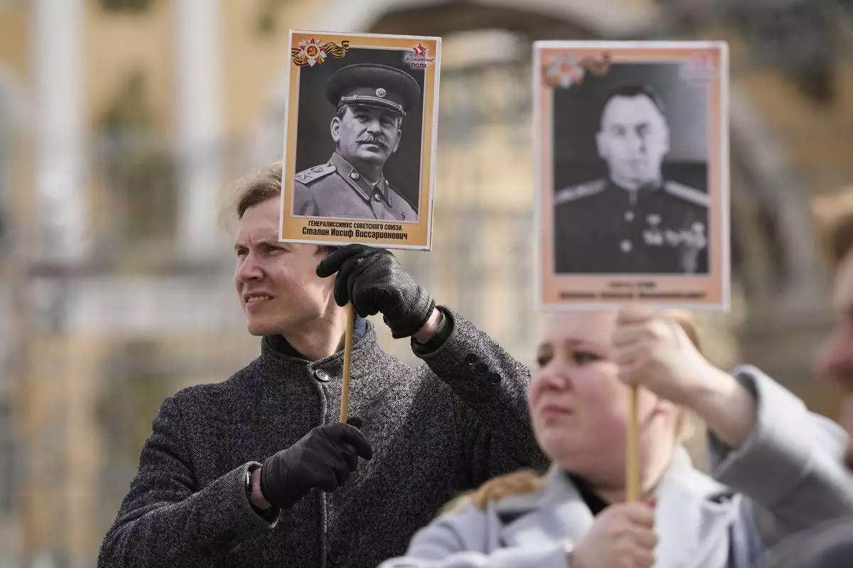 An actor holds a portrait of Soviet leader Joseph Stalin, left, as he marches with other actors holding portraits of Soviet military leaders during a rehearsal for the Victory Day military parade at the Dvortsovaya (Palace) Square in St. Petersburg, Russia, Wednesday, April 30, 2025. (AP Photo/Dmitri Lovetsky)