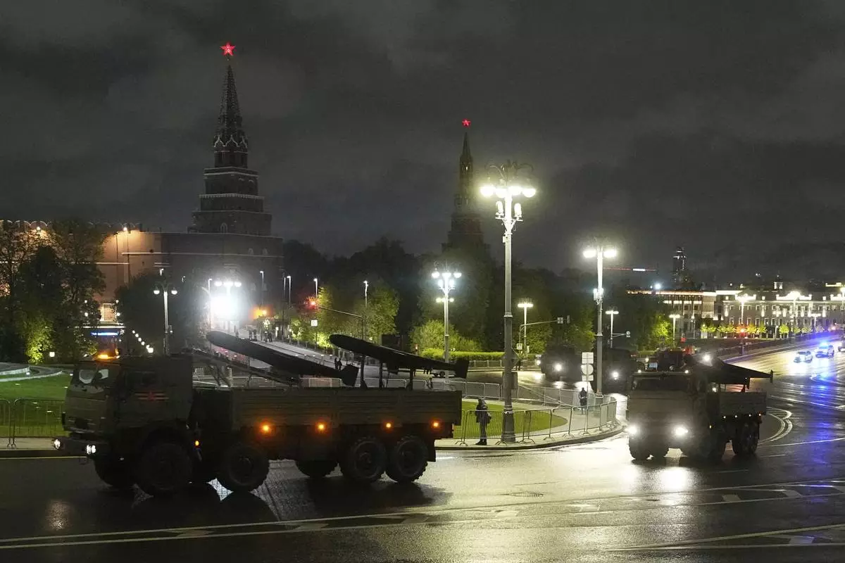 Russian military trucks carrying Geran-2 unmanned aerial vehicles roll along Borovitskaya Square next to the Kremlin after a rehearsal for the Victory Day military parade in Moscow, Russia, on Tuesday, April 29, 2025. (AP Photo/Pavel Bednyakov)