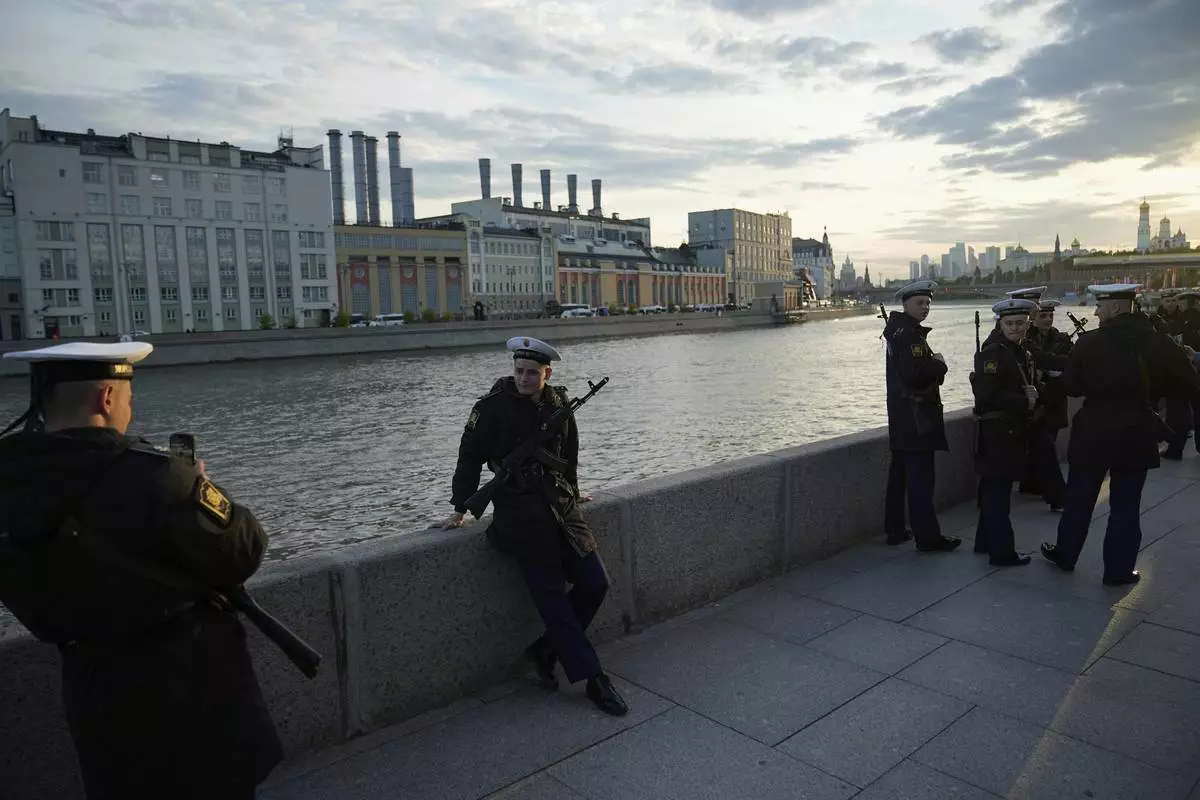 Russian servicemen gather at Ustyinskaya embankment prior to the Victory Day military parade rehearsal at the Red Square in Moscow, Russia, Saturday, May 3, 2025. (AP Photo/Pavel Bednyakov)