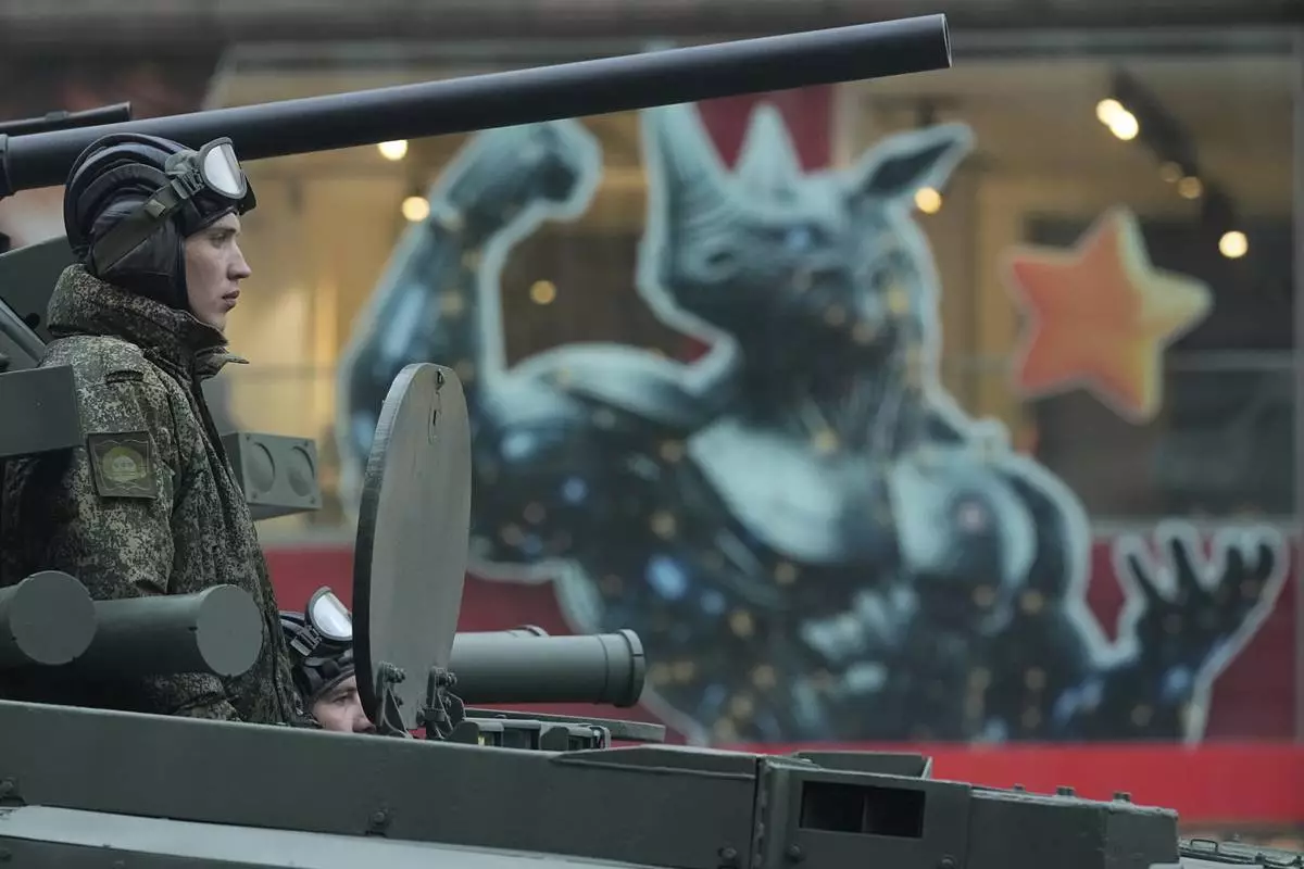 Russian soldiers sit at a tank driving along Tverskaya street to attend a rehearsal for the Victory Day military parade in Moscow, Russia, on Tuesday, April 29, 2025. (AP Photo/Pavel Bednyakov)