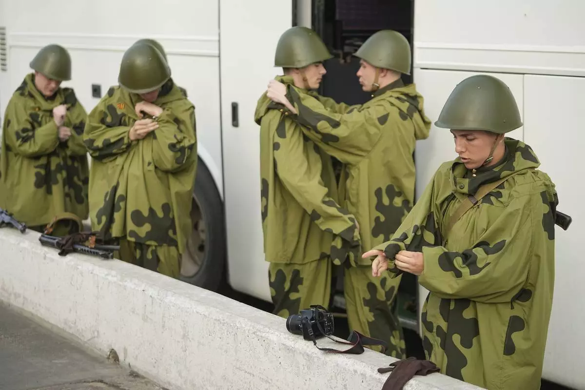 Russian servicemen prepare prior to the Victory Day military parade general rehearsal in Moscow, Russia, Wednesday, May 7, 2025. (AP Photo/Pavel Bednyakov)