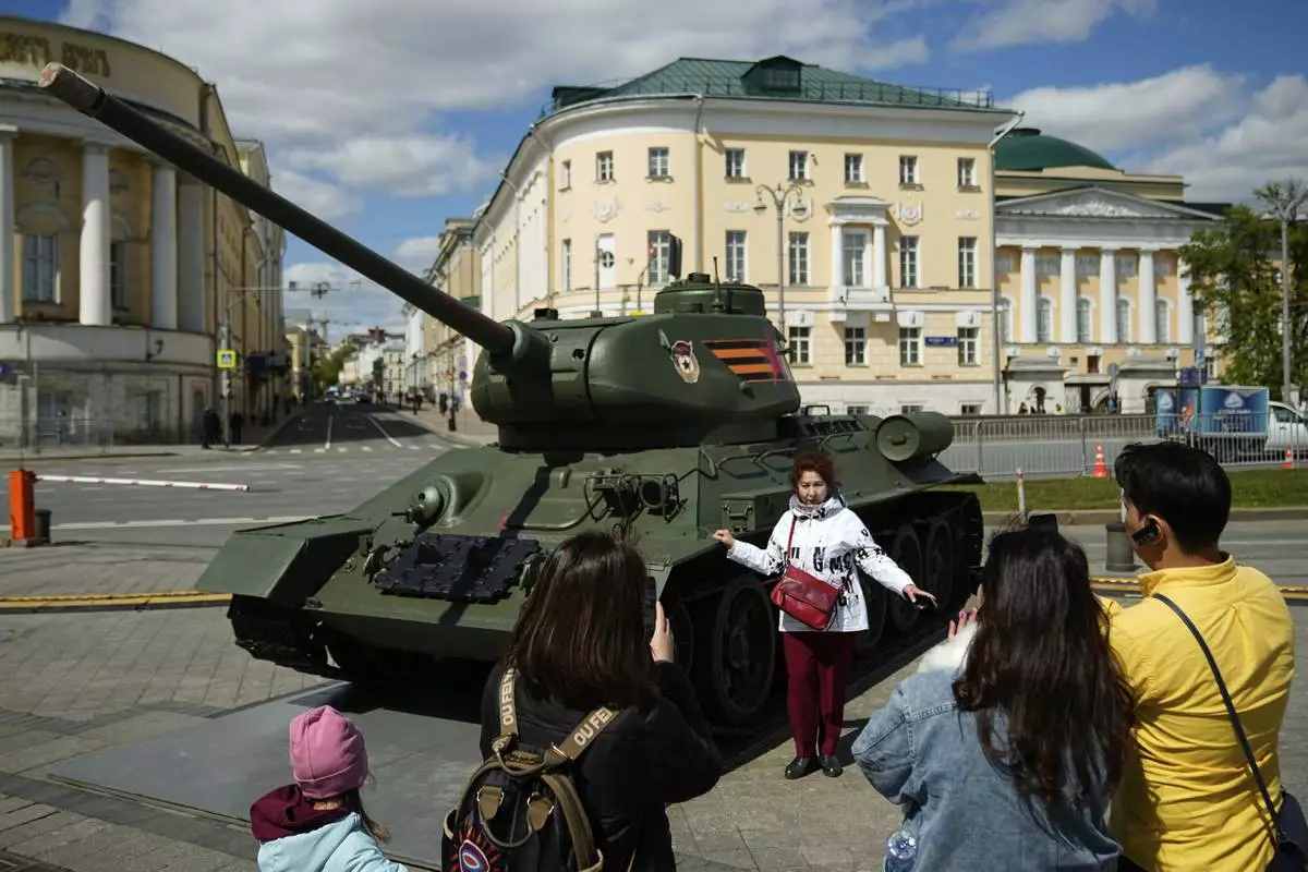 A woman poses for a photo next to a Soviet T-24 battle tank displayed at Manezhnaya square ahead of celebrations of the 80th anniversary of the Soviet Union's victory over Nazi Germany during the World War II, in Moscow, Russia, Tuesday, May 6, 2025. (AP Photo/Pavel Bednyakov)