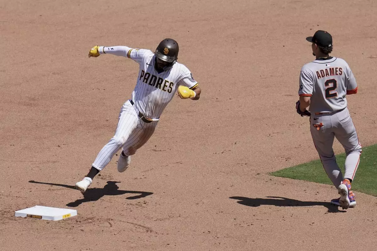 San Diego Padres' Fernando Tatis Jr., left, rounds second base, advancing to third off a single by Luis Arraez as San Francisco Giants shortstop Willy Adames looks on during the fifth inning of a baseball game Wednesday, April 30, 2025, in San Diego. (AP Photo/Gregory Bull)