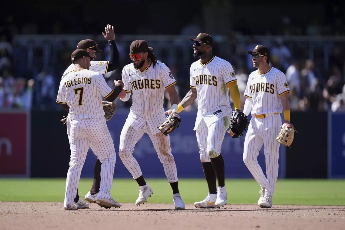 San Diego Padres right fielder Fernando Tatis Jr., center, celebrates with teammates after the Padres defeated the San Francisco Giants 5-3 in a baseball game Wednesday, April 30, 2025, in San Diego. (AP Photo/Gregory Bull)