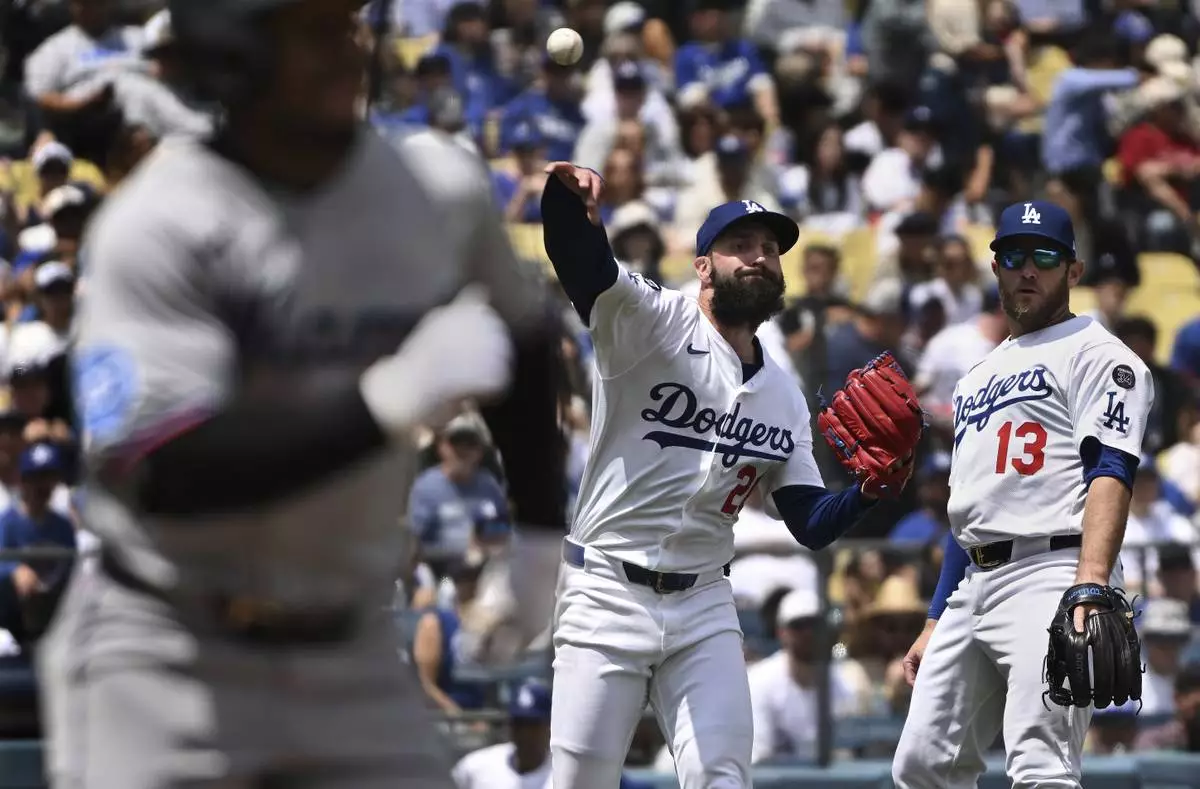Los Angeles pitcher Tony Gonsolin (26) throws out Miami Marlins Xavier Edwards (9) at first base as Los Angeles Dodgers third base Max Muncy (13) looks on in the third inning of a baseball game, Wednesday, April 30, 2025, in Los Angeles. (AP Photo/Wally Skalij)