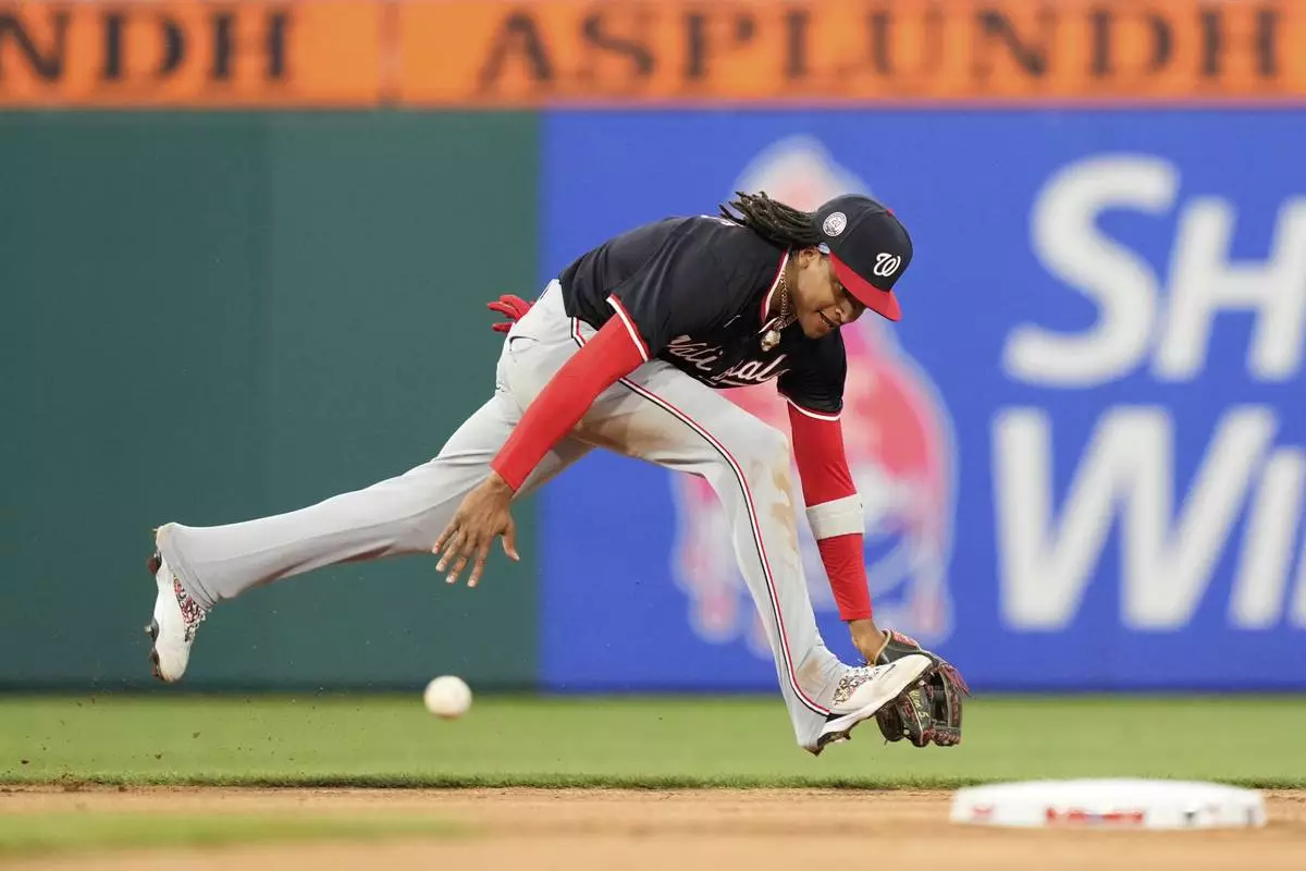 Washington Nationals shortstop CJ Abrams cannot reach a single by Philadelphia Phillies' J.T. Realmuto during the fourth inning of a baseball game, Wednesday, April 30, 2025, in Philadelphia. (AP Photo/Matt Slocum)