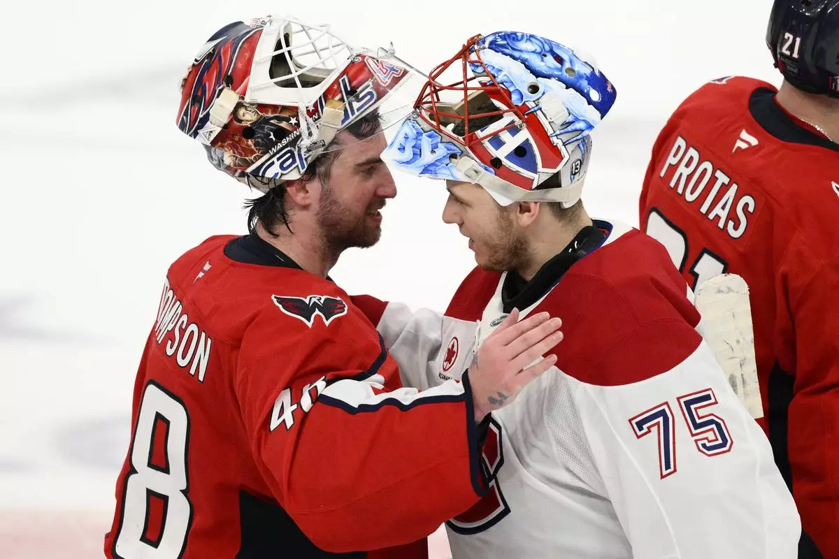 Washington Capitals goaltender Logan Thompson (48) greets Montreal Canadiens goaltender Jakub Dobes (75) after Game 5 of a first-round NHL hockey playoff series Wednesday, April 30, 2025, in Washington. (AP Photo/Nick Wass)