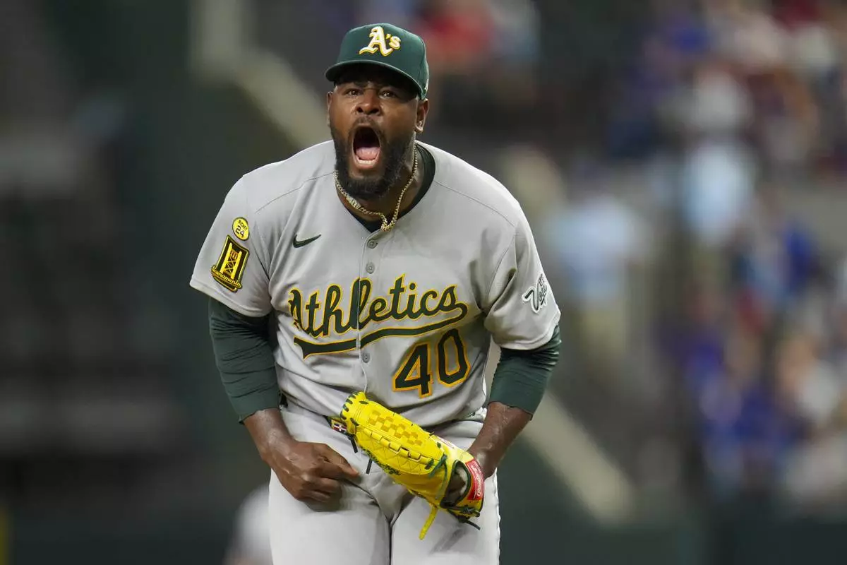 Oakland Athletics starting pitcher Luis Severino reacts after striking out Texas Rangers' Jake Burger with the bases loaded to end the third inning of a baseball game Wednesday, April 30, 2025, in Arlington, TX. (AP Photo/Julio Cortez)