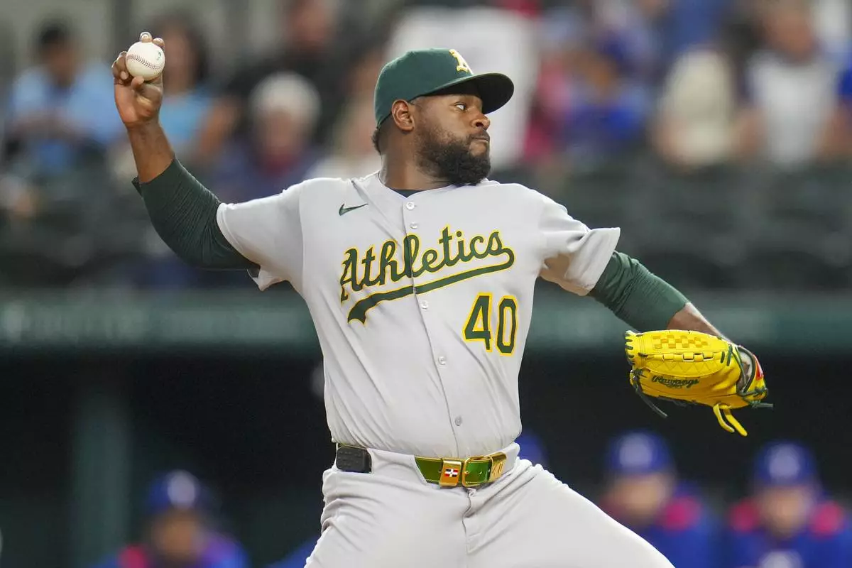 Oakland Athletics starting pitcher Luis Severino throws a pitch to the Texas Rangers during the first inning of a baseball game Wednesday, April 30, 2025, in Arlington, TX. (AP Photo/Julio Cortez)