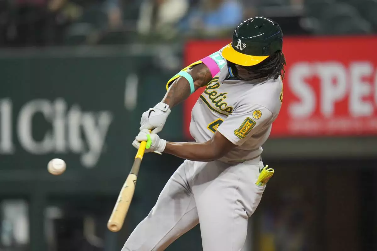 Oakland Athletics' Lawrence Butler connects for a single against the Texas Rangers for during the third inning of a baseball game Wednesday, April 30, 2025, in Arlington, TX. (AP Photo/Julio Cortez)