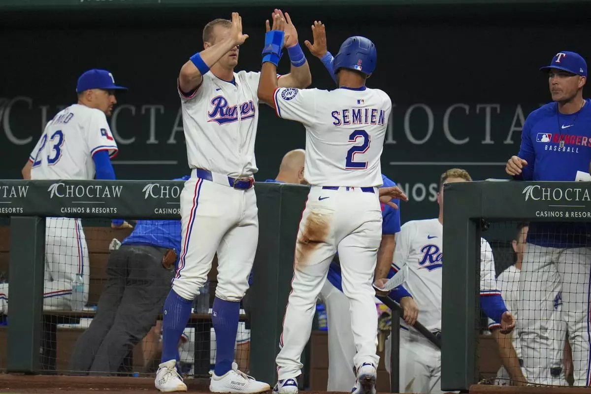 Texas Rangers' Marcus Semien (2) is greeted near the dugout by Josh Jung after scoring on a single by Adolis García against the Oakland Athletics during the fourth inning of a baseball game Wednesday, April 30, 2025, in Arlington, TX. (AP Photo/Julio Cortez)