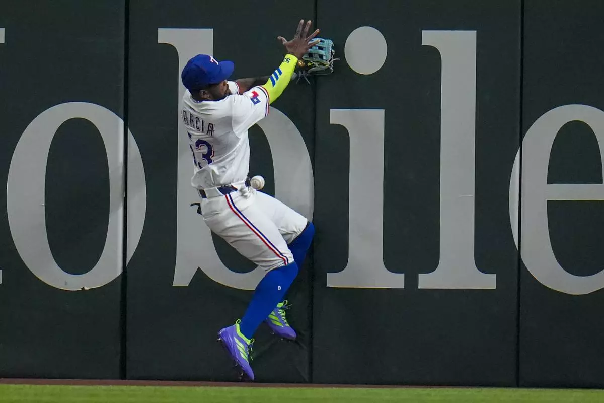 Texas Rangers outfielder Adolis García crashes with the wall while chasing a double by Oakland Athletics' JJ Bleday during the third inning of a baseball game Wednesday, April 30, 2025, in Arlington, TX. (AP Photo/Julio Cortez)