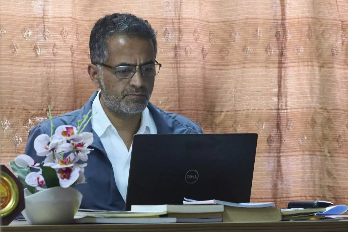 Sunil Babu Pant, right, an openly gay former parliamentarian and a leading LGBTQ+ campaigner, works at his office in Kathmandu, Nepal, March 20, 2025. (AP Photo/Niranjan Shrestha)