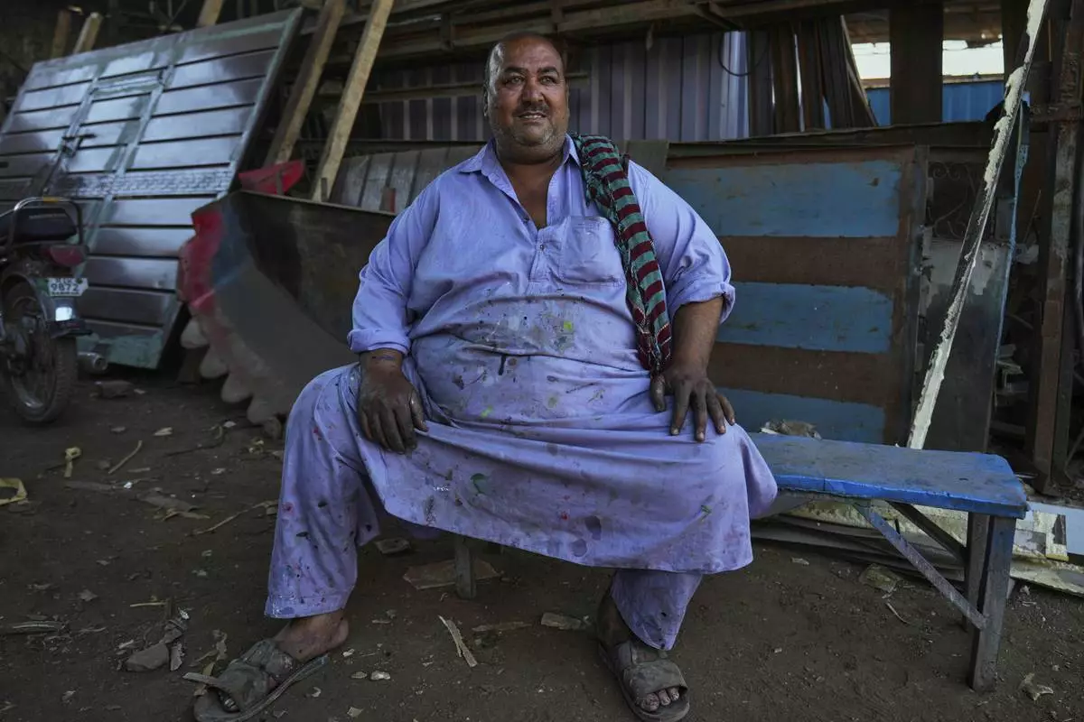 Artisan Muhammad Ashfaq, 55, sits for a portrait at his workshop in Rawalpindi, Pakistan, on Sunday, April 27, 2025. (AP Photo/Anjum Naveed)