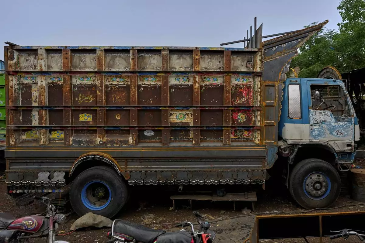 A truck waits for refurbishment at a yard for workshops in Rawalpindi, Pakistan, on Saturday, April 19, 2025. (AP Photo/Anjum Naveed)