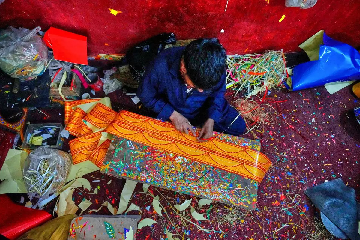 An artisan makes traditional patterns with colorful stickers used to decorate trucks at a yard for workshops in Rawalpindi, Pakistan, on Saturday, April 19, 2025. (AP Photo/Anjum Naveed)