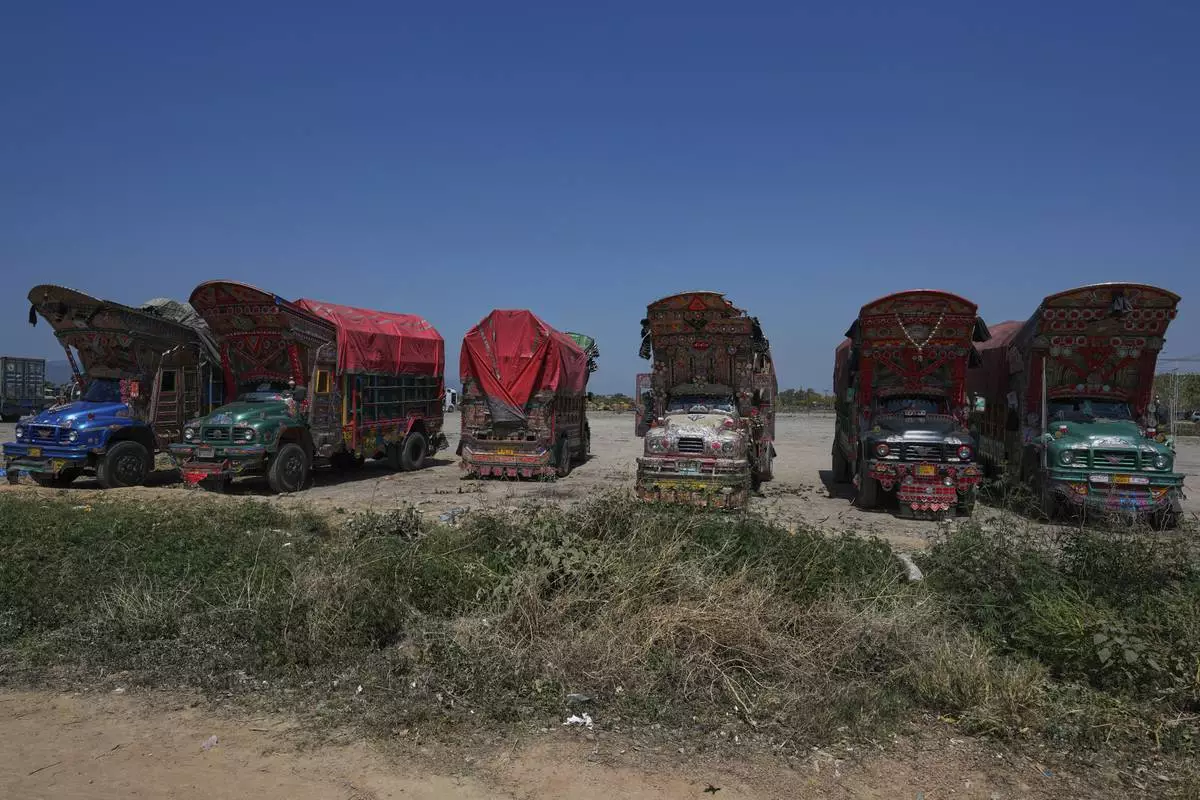 Trucks decorated with artwork are parked at a terminal on the outskirts of Islamabad, Pakistan, on Sunday, April 27, 2025. (AP Photo/Anjum Naveed)