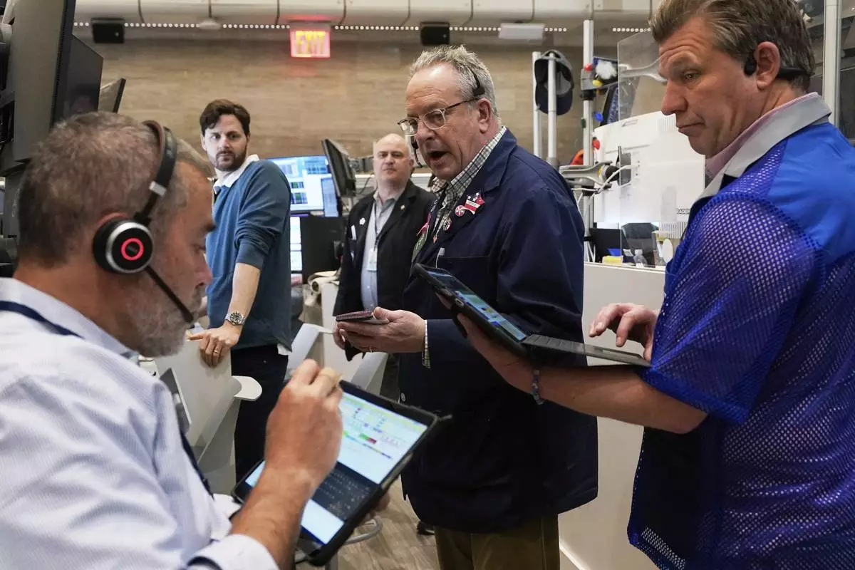 Bobby Charmak, center, works on the floor at the New York Stock Exchange in New York, Wednesday, April 30, 2025. (AP Photo/Seth Wenig)