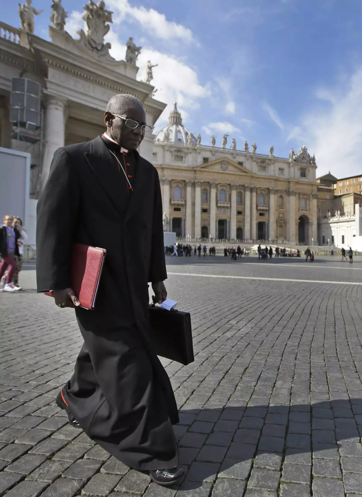 FILE - In this March 4, 2013 file photo, Cardinal Robert Sarah, of Guinea, walks in St. Peter's Square after attending a cardinals' meeting, at the Vatican. (AP Photo/Andrew Medichini, File)