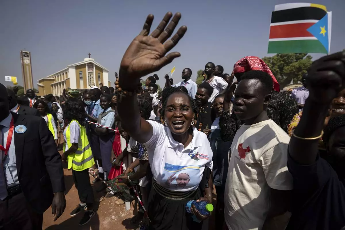FILE - People in the crowd cheer and wave as Pope Francis is wheeled past after addressing clergy at the St. Theresa Cathedral in Juba, South Sudan, Saturday, Feb. 4, 2023. (AP Photo/Ben Curtis, File)