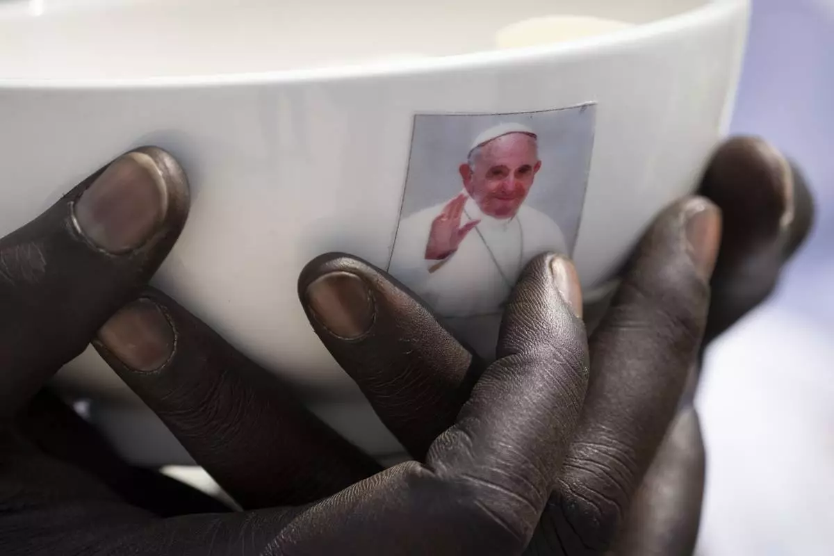 FILE - A priest holds a sacrament bowl showing a photograph of Pope Francis during a Holy Mass at the John Garang Mausoleum in Juba, South Sudan, Feb. 5, 2023. (AP Photo/Ben Curtis, File)