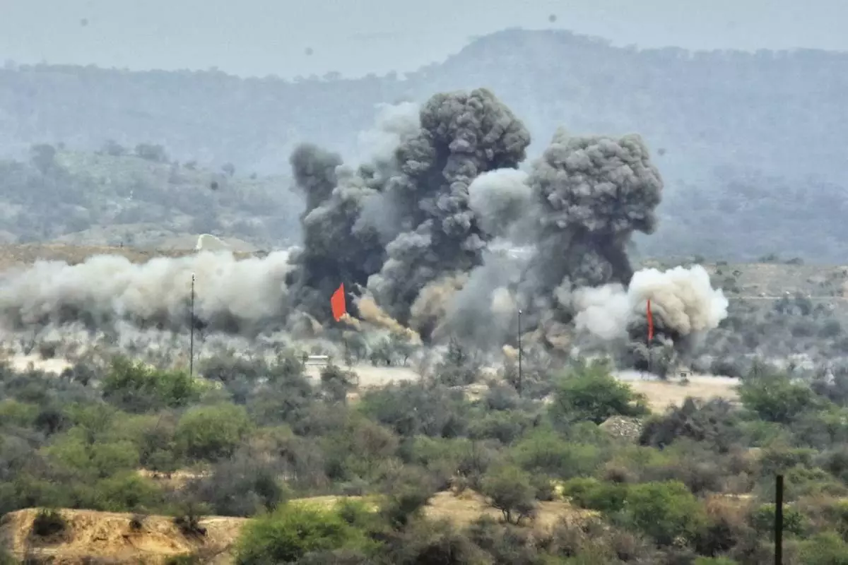 In this photo released by the Inter Services Public Relations, smoke erupts on mock target after Pakistani army artillery fire shell during a military exercises, in Tilla Field Firing Range, in the Jhelum district, Pakistan, Thursday, May 1, 2025. (Inter Services Public Relations via AP)