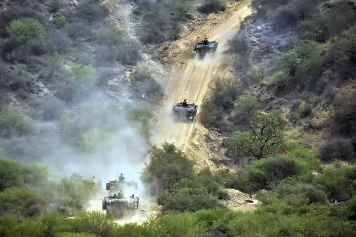 In this photo released by the Inter Services Public Relations, Army tanks roll down during a military exercises in Tilla Field Firing Range, in the Jhelum district, Pakistan, Thursday, May 1, 2025. (Inter Services Public Relations via AP)