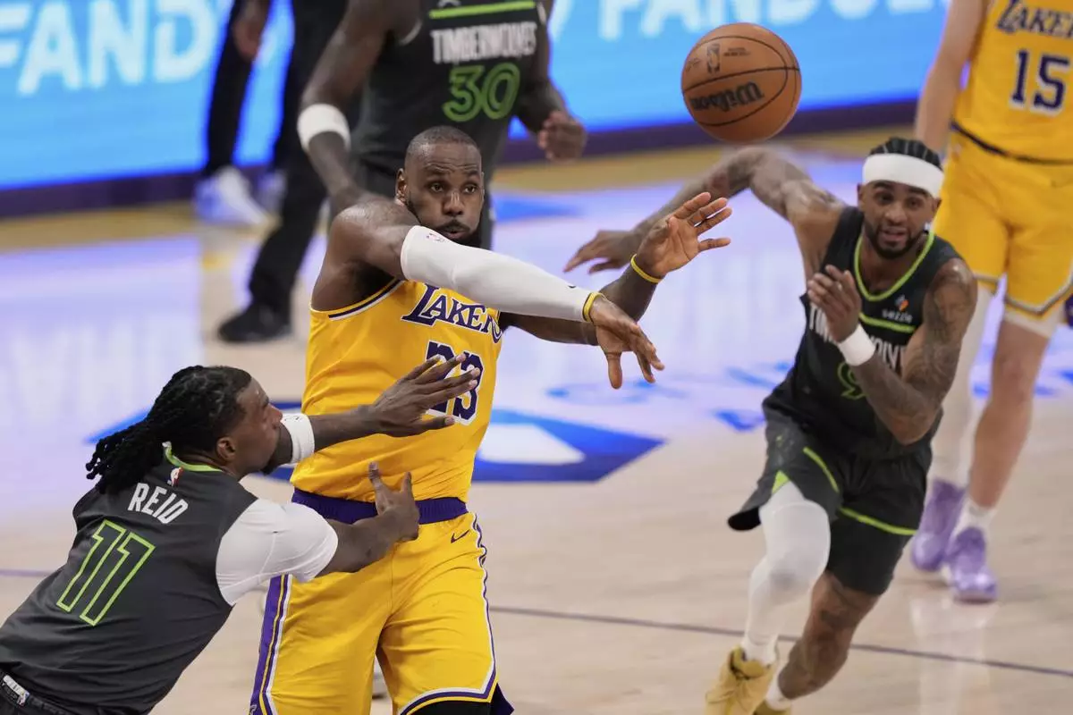 Los Angeles Lakers forward LeBron James, center, passes the ball as Minnesota Timberwolves center Naz Reid, left, and guard Nickeil Alexander-Walker defend during the second half in Game 5 of an NBA basketball first-round playoff series Wednesday, April 30, 2025, in Los Angeles. (AP Photo/Mark J. Terrill)