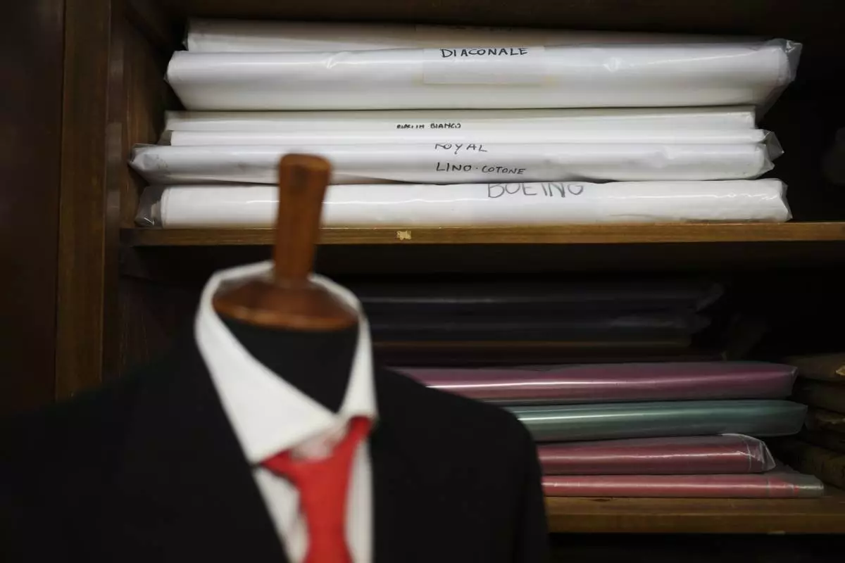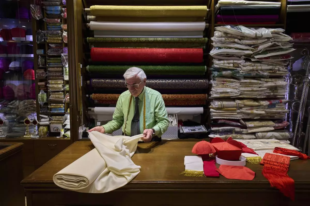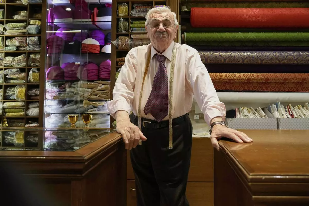 Italian tailor Raniero Mancinelli ,who on his own initiative is making outfits for a possible future Pope, is interviewed by the Associated Press inside his shop in Rome, Wednesday, April 30, 2025. (AP Photo/Gregorio Borgia)