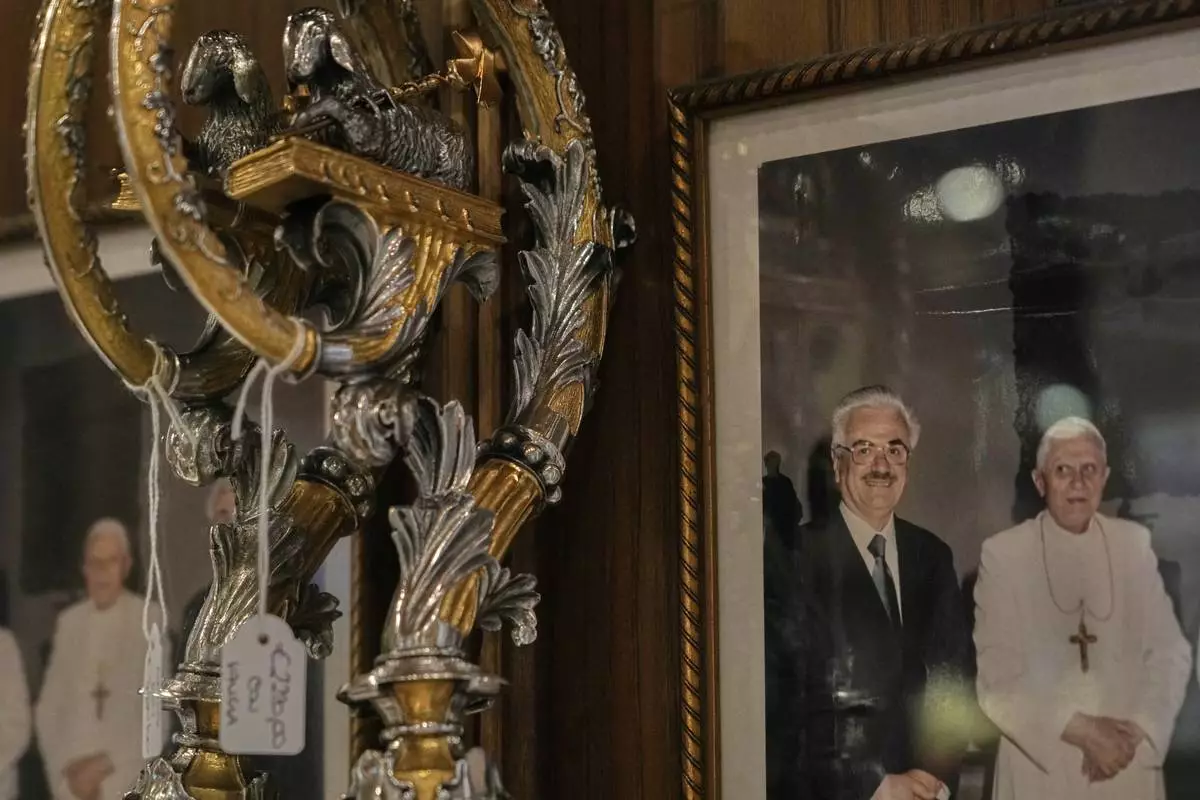 A picture of Italian tailor Raniero Mancinelli and late Pope Benedict XVI hangs inside Mancinelli's shop in Rome, Wednesday, April 30, 2025. (AP Photo/Gregorio Borgia)