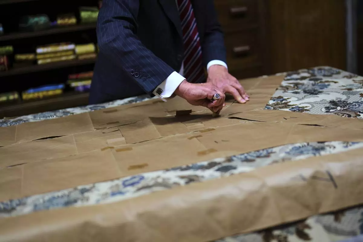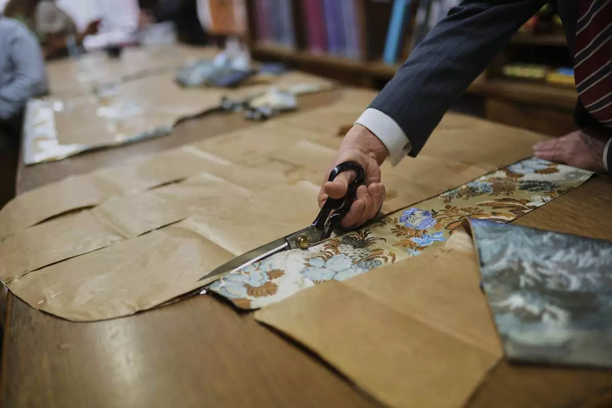 A tailor uses a pattern to cut fabric at the Gammarelli ecclesiastic clothes tailor shop in Rome, Wednesday, April 30, 2025. (AP Photo/Francisco Seco)