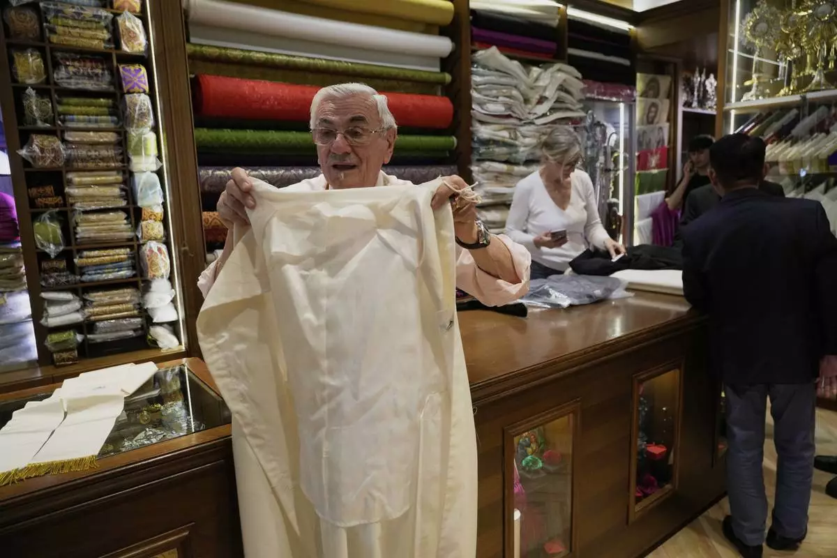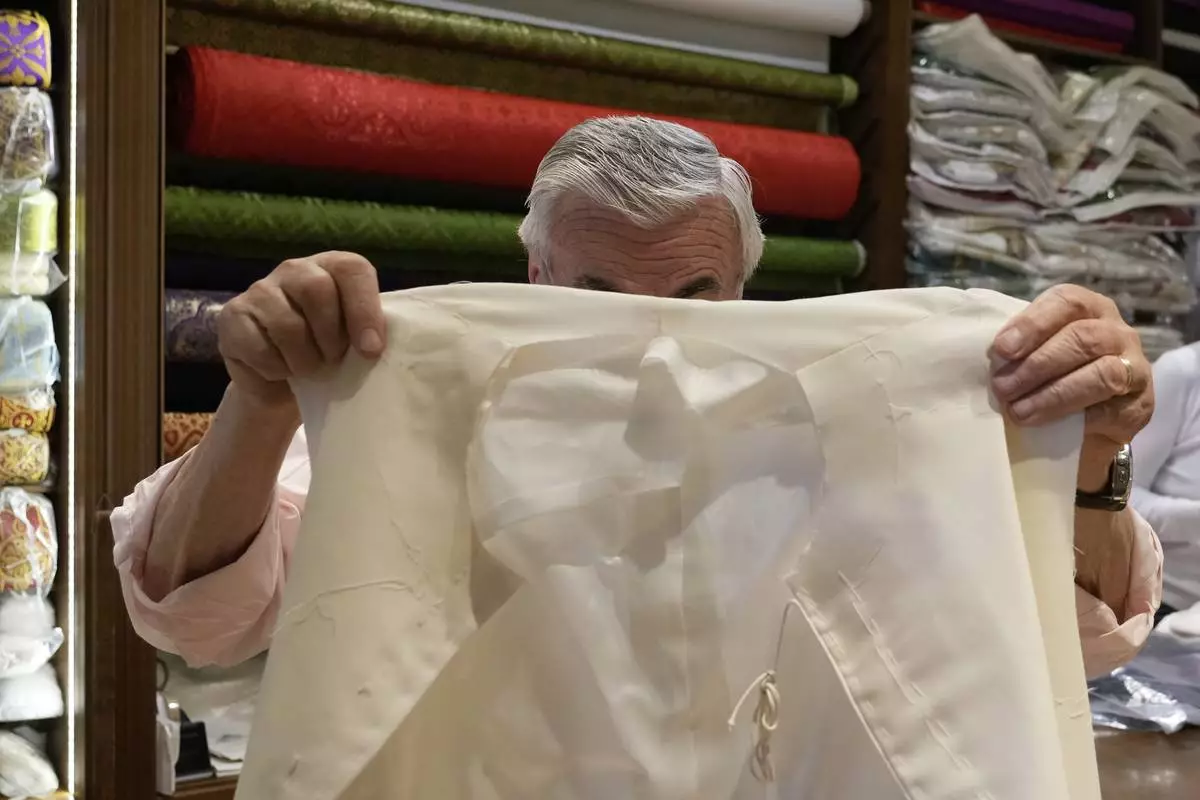 Italian tailor Raniero Mancinelli, who on his own initiative is making outfits for a possible future Pope, shows a pontiff's unfinished garment as he is interviewed by the Associated Press inside his shop in Rome, Wednesday, April 30, 2025. (AP Photo/Gregorio Borgia)