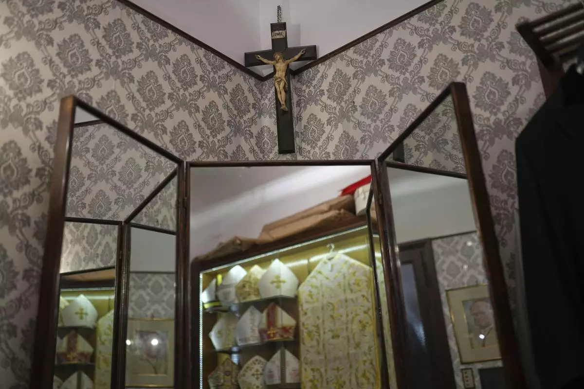 A crucifix hangs over a mirror reflecting ecclesiastic clothes inside the dressing room at the Gammarelli tailor shop in Rome, Wednesday, April 30, 2025. (AP Photo/Francisco Seco)