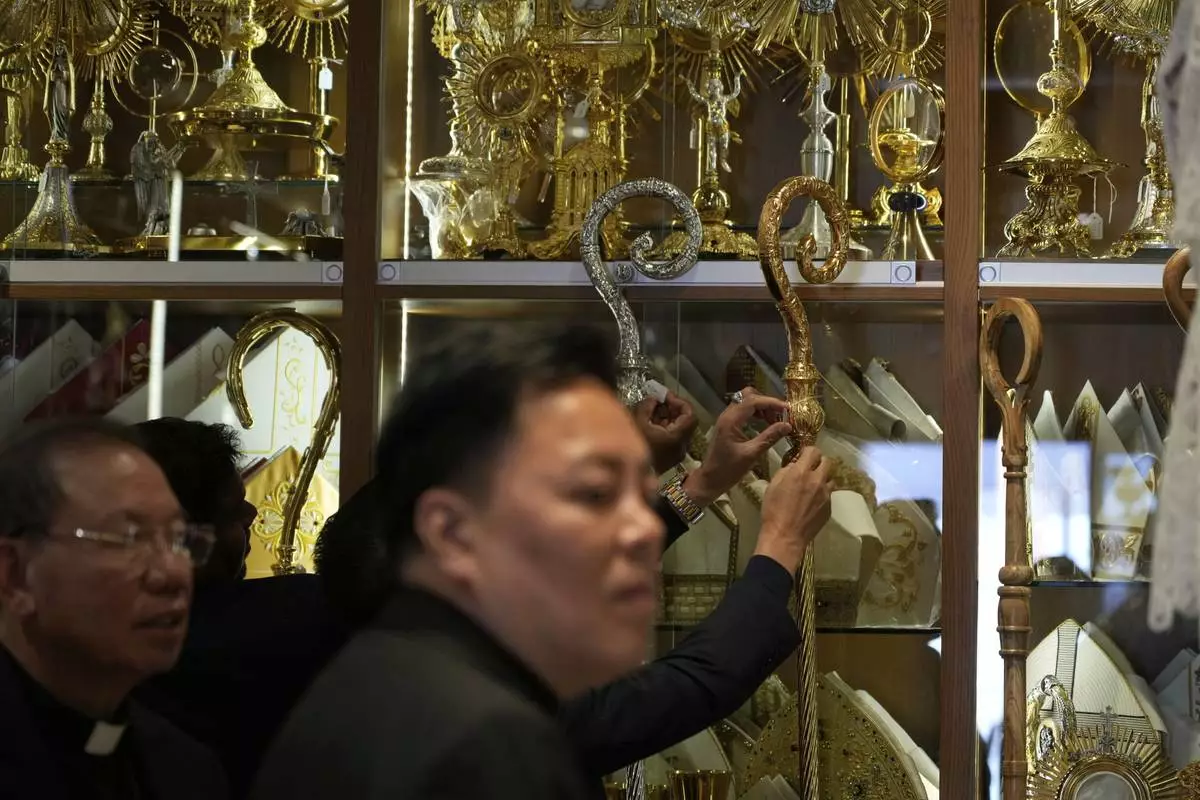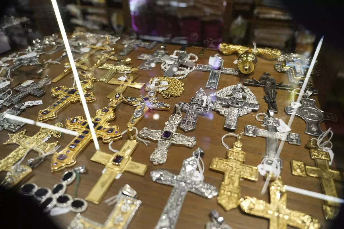 Crosses are displayed inside the shop of Italian tailor Raniero Mancinelli, in Rome, Wednesday, April 30, 2025. (AP Photo/Gregorio Borgia)