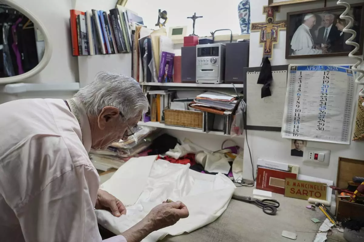 Italian tailor Raniero Mancinelli. who on his own initiative is making outfits for a possible future Pope, works on a pontiff's robe inside his shop in Rome, Wednesday, April 30, 2025. (AP Photo/Gregorio Borgia)