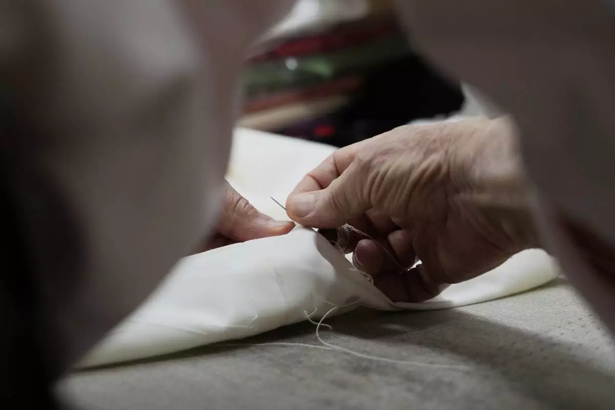 A tailor works at the Gammarelli ecclesiastic clothes tailor shop in Rome, Wednesday, April 30, 2025. (AP Photo/Francisco Seco)