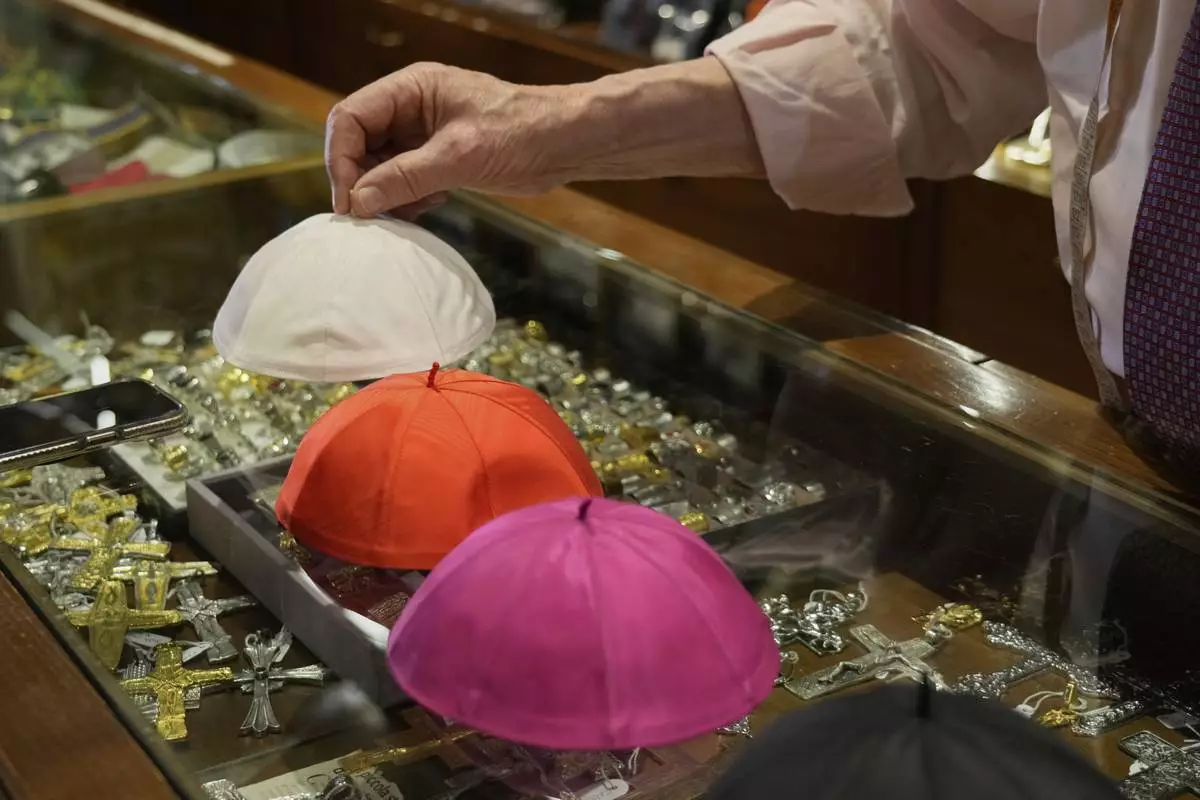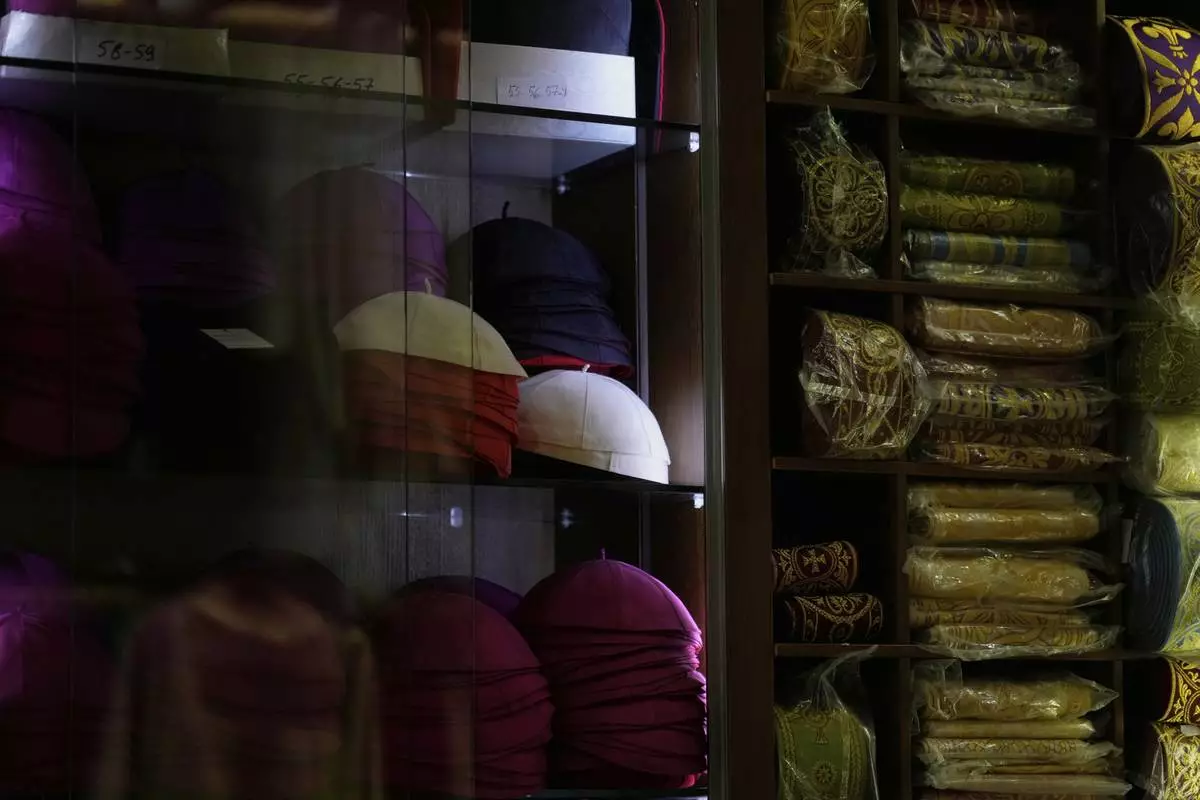 Italian tailor Raniero Mancinelli, who on his own initiative is making outfits for a possible future Pope, shows a pontiff's skull cap as he is interviewed by the Associated Press inside his shop, in Rome, Wednesday, April 30, 2025. (AP Photo/Gregorio Borgia)
