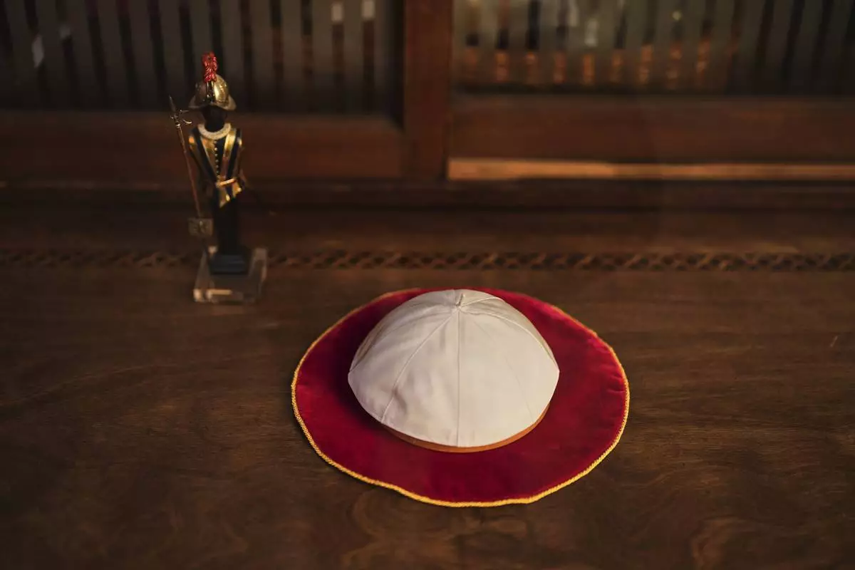 A Pope skullcap lays in the display window of the Gammarelli ecclesiastic clothes tailor shop in Rome, Wednesday, April 30, 2025. (AP Photo/Francisco Seco)