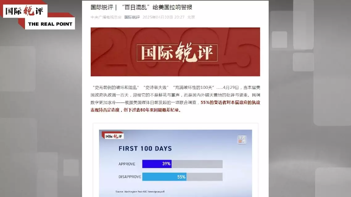 A Chinese language media commentary pointed out that the Trump administration's first 100 days were full of epic policy failures, and it faces mounting domestic and international criticism.