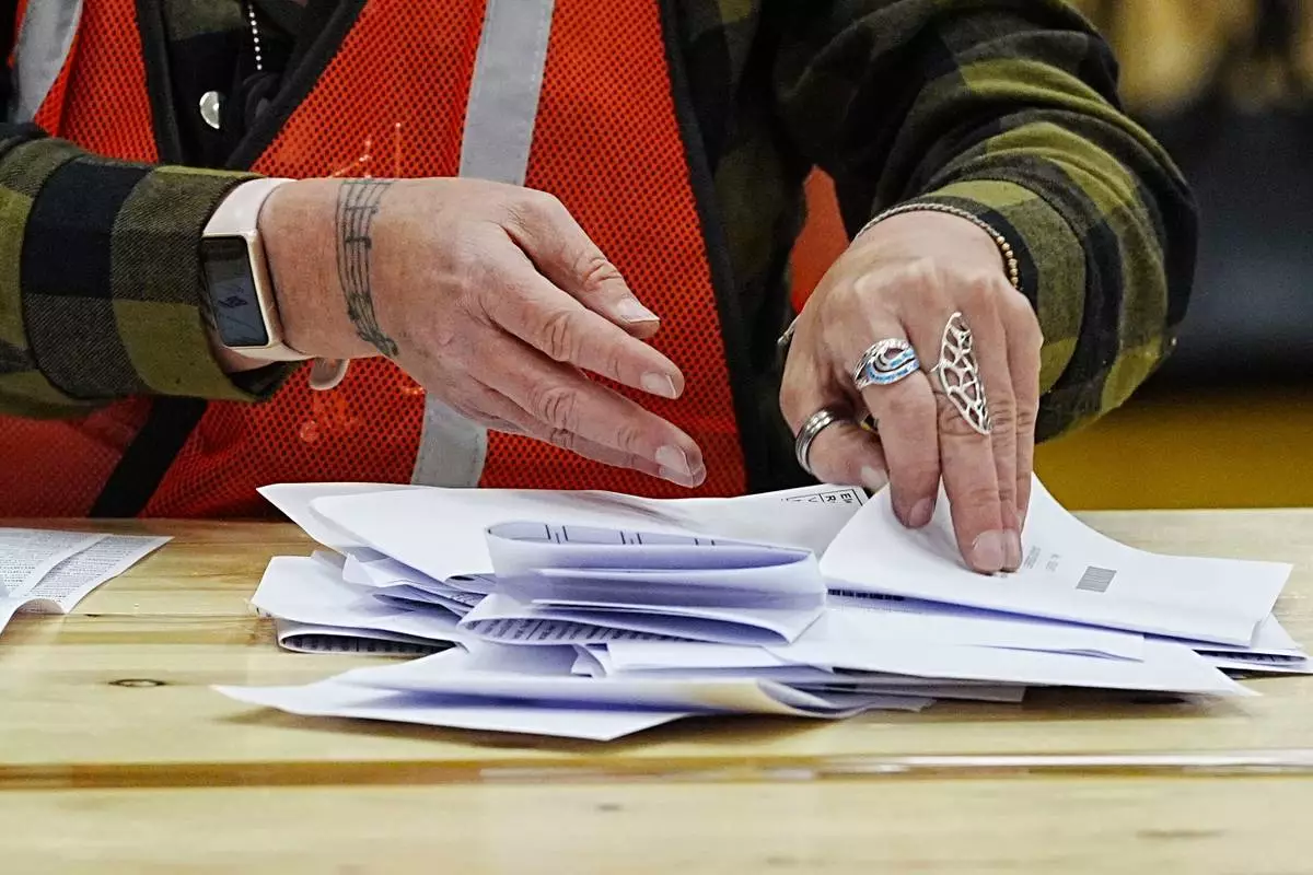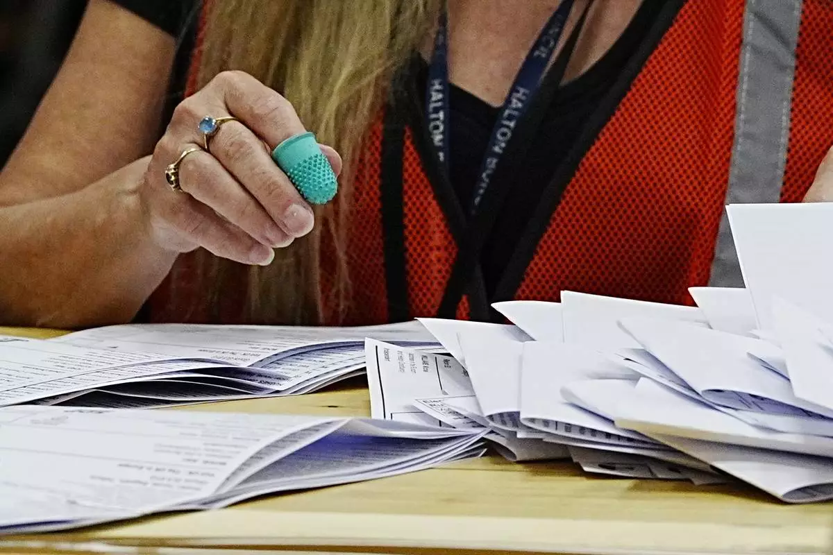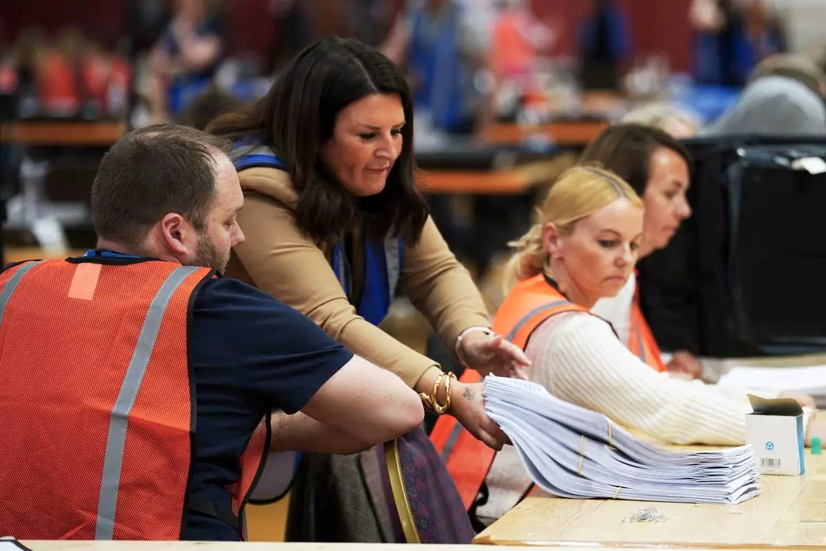 Votes are counted at DCBL Halton Stadium, in Widnes, Cheshire, England, for the Runcorn and Helsby by-election that was triggered by the resignation of former Labour MP Mike Amesbury, Thursday May 1, 2025. (Peter Byrne/PA via AP)