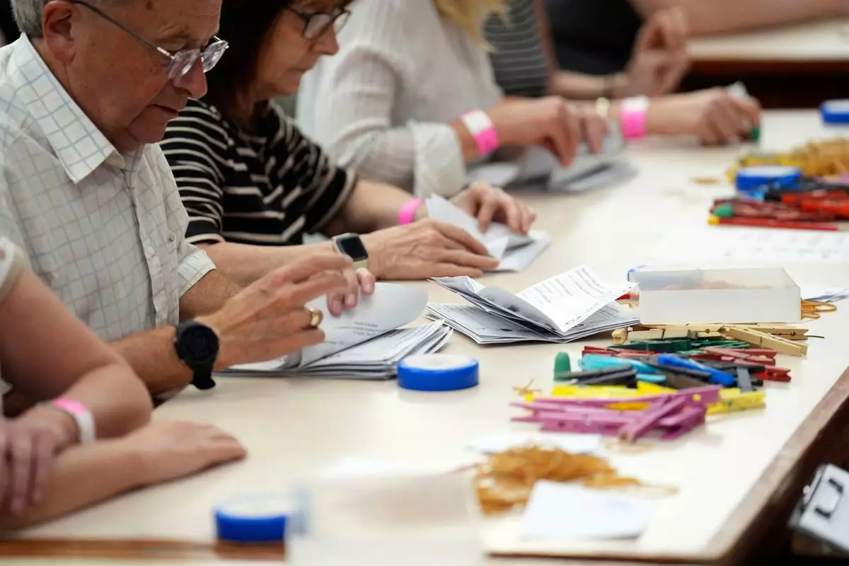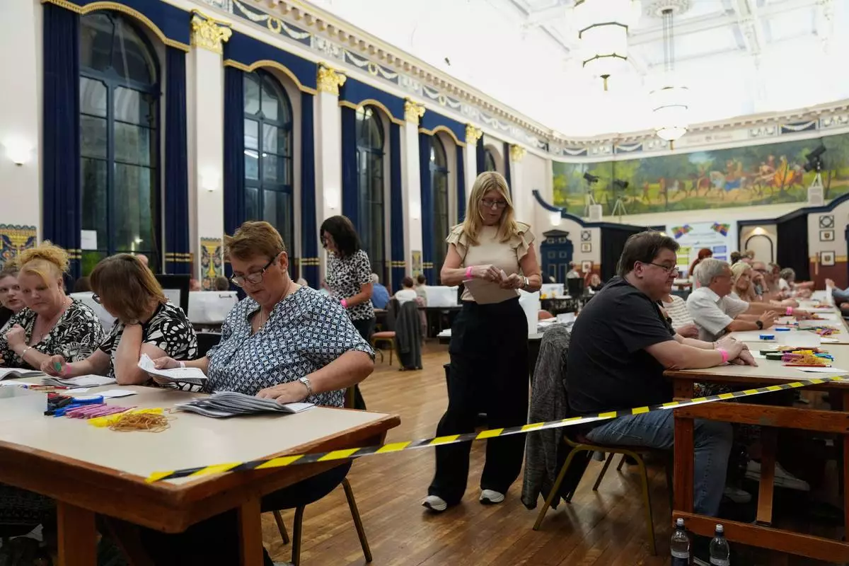 Votes are counted at Grimsby Town Hall, in Lincolnshire, England, for the Greater Lincolnshire Mayor election, Thursday, May 1, 2025. (Joe Giddens/PA via AP)