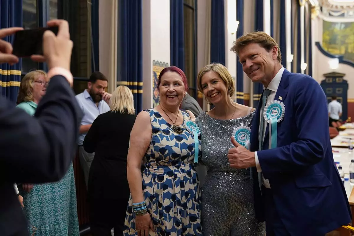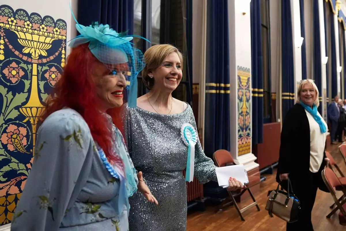 Reform UK's Greater Lincolnshire mayoral candidate Dame Andrea Jenkyns, centre, with Reform U.K. deputy leader Richard Tice, right, during the count at Grimsby Town Hall, in Lincolnshire, England, for the Greater Lincolnshire Mayor election, Friday, May 2, 2025. (Joe Giddens/PA via AP)